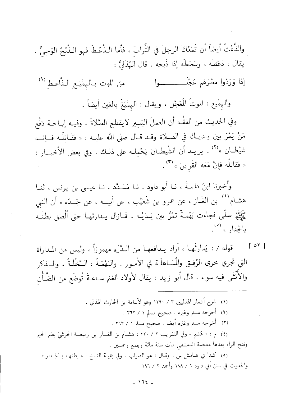 وَأَخْبَرَنَا ابْنُ دَاسَةَ نا أَبُو دَاوُدَ نا مُسَدِّدٌ نا عِيسَى بْنُ يُونُسَ ثنا هِشَامُ 4 بْنُ الْغَازِ عَنْ عَمْرِو بْنِ شُعَيْبٍ عَنْ أَبِيهِ عَنْ جَدِّهِ "أَنَّ النَّبِيِّ صَلَّى اللَّهُ عَلَيْهِ وَسَلَّمَ فَجَاءَتْ بَهْمَةٌ تَمُرُّ بَيْنَ يَدَيْهِ فَمَا زَالَ يُدَارِئُهَا حَتَّى أَلْصَقَ بَطْنَهُ بِالْجِدَارِ"5