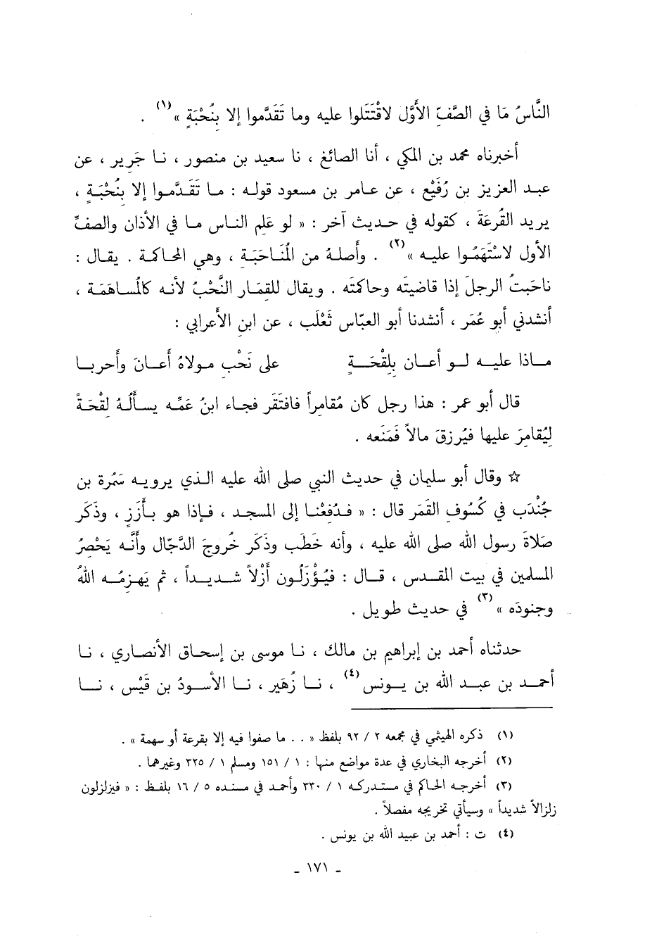 أَخْبَرَنَاهُ مُحَمَّدُ بْنُ الْمَكِّيِّ أنا الصَّائِغُ نا سَعِيدُ بْنُ مَنْصُورٍ نا جَرِيرٌ عَنْ عَبْدِ الْعَزِيزِ بْنِ رُفَيْعٍ عَنْ عَامِرِ بْنِ مَسْعُودٍ قَوْلَهُ: مَا تَقَدَّمُوا إِلا بِنُحْبَةٍ يُرِيدُ الْقُرْعَةَ كَقَوْلِهِ فِي حَدِيثٍ آخَرَ: "لَوْ عَلِمَ النَّاسُ مَا فِي الأَذَانِ وَالصَّفِّ الأَوَّلِ لاسْتَهَمُوا عَلَيْهِ" 2 وأَصلهُ من المُنَاحَبَةِ وهي المحاكمة يقال: ناحَبتُ الرجلَ إذا قاضيتَه وحاكمتَه ويقال: للقِمَار النَّحْبُ لأنه كالمُساهَمَة أنشدني أبو عُمَر أنشدنا أبو العباس ثَعْلَب عن ابنِ الأعرابي: