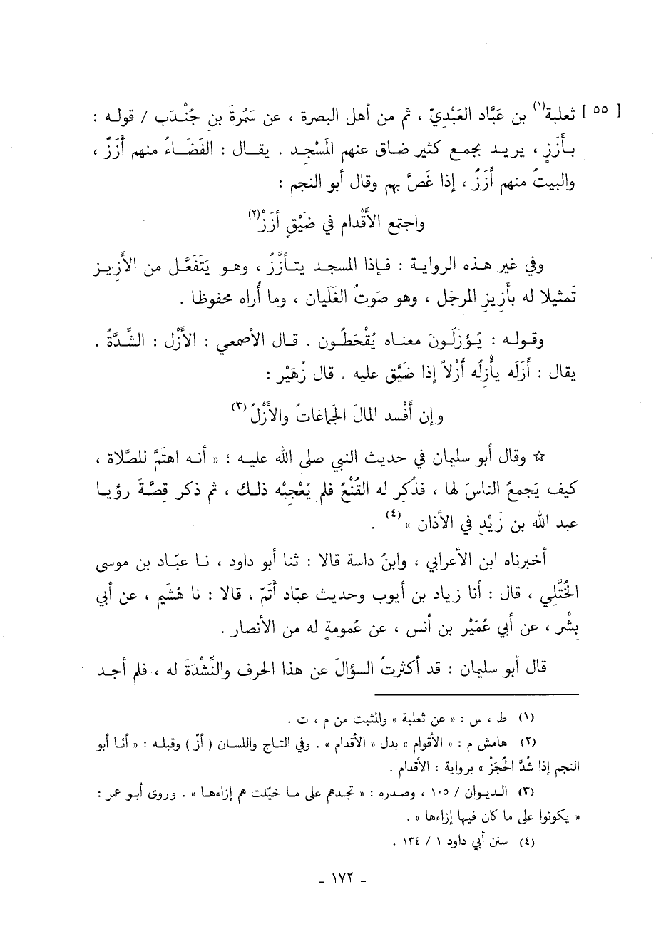 ثَعْلَبَةُ 1 بْنُ عَبَّادٍ الْعَبْدِيُّ ثُمَّ مِنْ أَهْلِ الْبَصْرَةِ عَنْ سَمُرَةَ بْنِ جُنْدَبٍ قوله: بأَزَزٍ يريد بجمع كثير ضاق عنهم المَسْجِد يقال الفضاء منهم أزز والبيتُ منهم أَزَزٌ إذا غَصَّ بهم وقال أبو النجم: