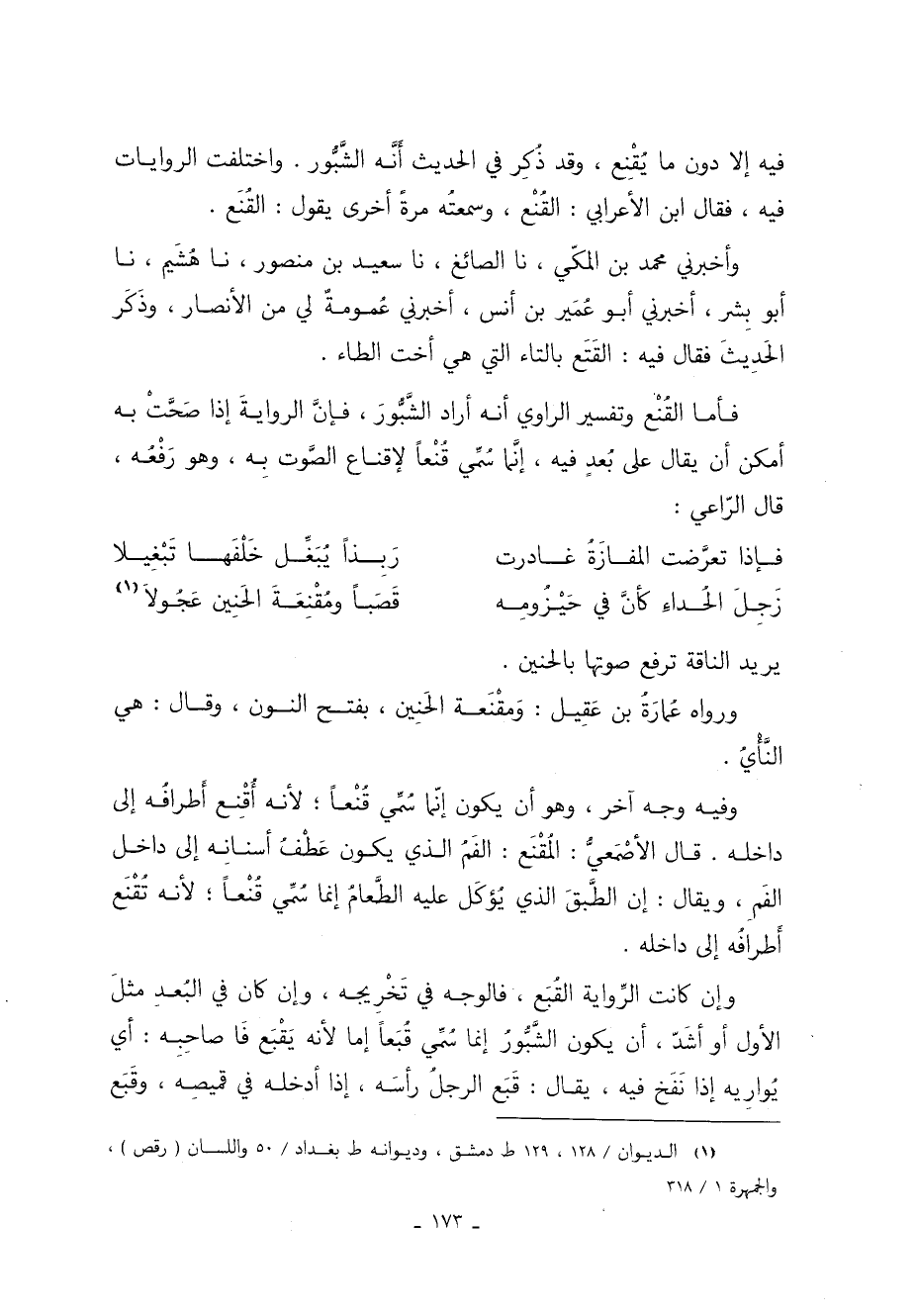 فيه إلا دون ما يُقْنِع وقد ذكر في الحديث أَنَّه الشَّبُّور واختلفت الروايات فيه فَقَالَ ابن الأعرابي القُنْع وسمعتُه مرةً أخرى يقول القُنَع.