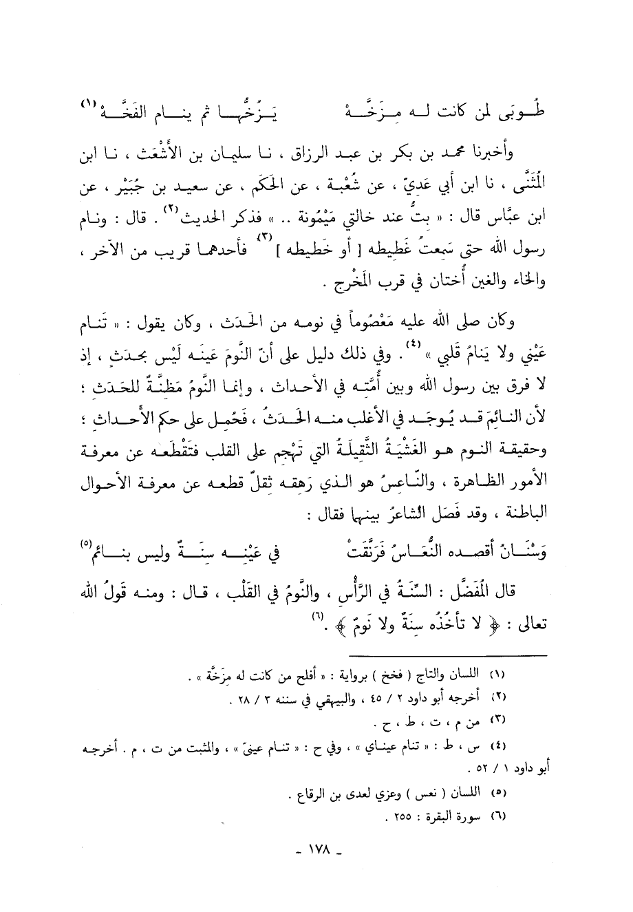 وكان مَعْصُومًا فِي نَوْمِهِ مِنَ الْحَدَثِ وَكَانَ يَقُولُ: "تَنَامُ عَيْنِي وَلا يَنَامُ قَلْبِي" 4 وفي ذَلِكَ دليل عَلَى أنّ النَّومَ عَينَه لَيْس بحدث إذ لا فرق بين رَسُول الله وبين أُمَّتِه في الأحداث وإنما النَّومَ مَظِنَّةٌ للحَدَث لأن النائِمَ قد يُوجَد في الأغلب منه الحَدَثُ فَحُمِل عَلَى حكم الأحداثَ وحقيقة النوم هو الغَشْيَةُ الثَّقِيلَةُ التي تَهْجِم عَلَى القلب فتَقْطَعه عن معرفة الأمور الظاهرة والناعِسُ هُوَ الَّذِي رَهِقه ثِقلٌ قطعه عن معرفة الأحوال الباطنة وقد فَصَل الشاعرُ بينهما فَقَالَ: