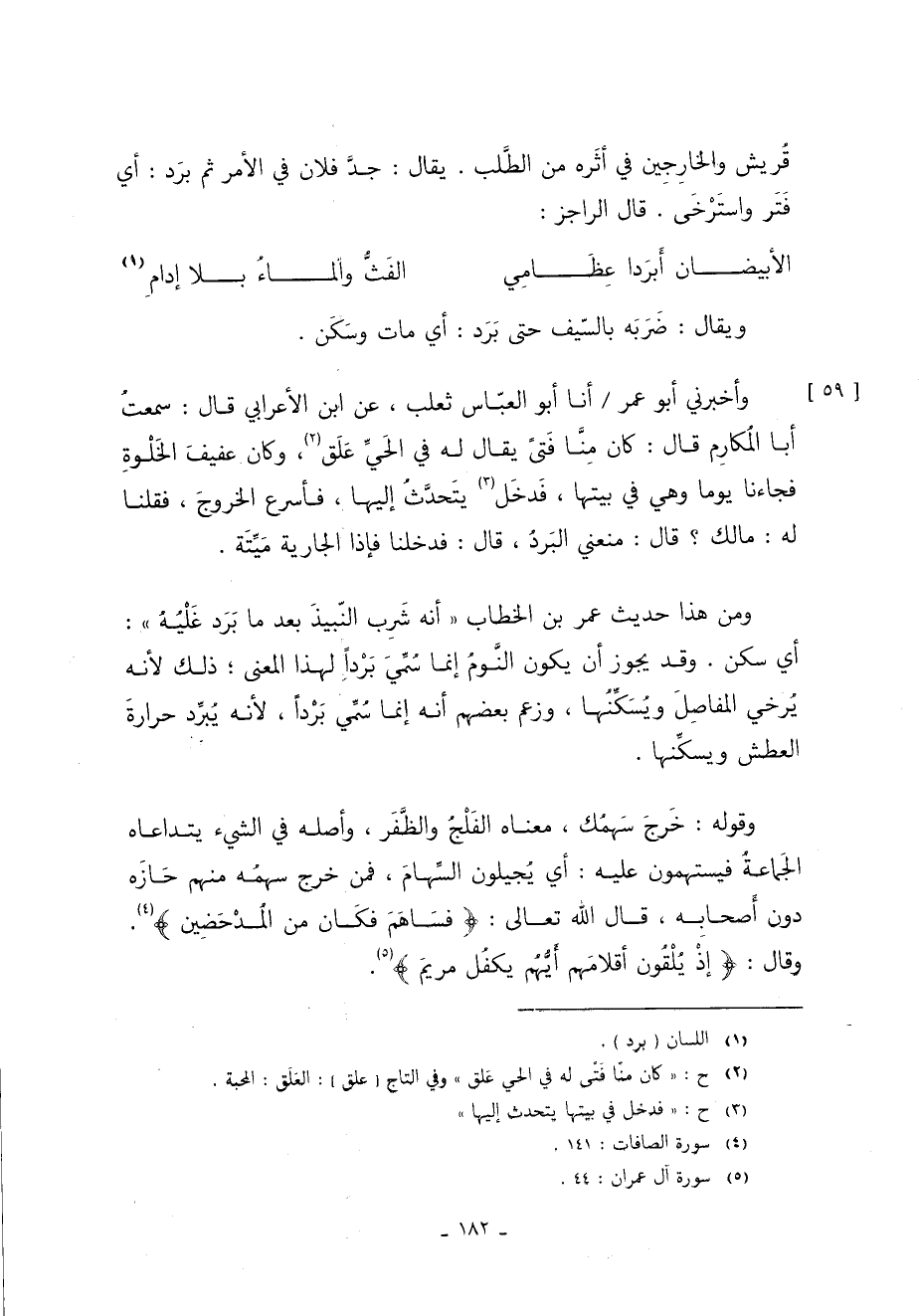 وأخبرني أبو عُمَرَ أنا أَبُو الْعَبَّاسِ ثَعْلَبٌ عن ابن الأعرابي قَالَ سمعتُ أبا المكارم قَالَ كان مِنَّا فَتى يقال له في الحَيَّ عَلَق 2 وكان عفيفَ الخَلْوةِ فجاءنا يومًا وهي في بيتها فَدخَل 3 يتَحدَّثُ إليها فأسرع الخروج فقلنا له ما لك قَالَ منعني البَردُ قَالَ فدخلنا فإذا الجارية مَيِّتَةٌ ومن هذا حديث عمر بن الخطاب أنه شَرِب النّبيذَ بعد ما بَرَد غَلْيُه أي سكن وقد يجوز أن يكون النَّومُ إنما سُمِّيَ بَرْدًا لهذا المعنى ذَلِكَ لأنه يُرخي المفاصِلَ ويُسَكِّنُها وزعم بعضهم أنه إنما سُمِّي بَرْدًا لأنه يُبرِّد حرارةَ العطش ويسكِّنها.