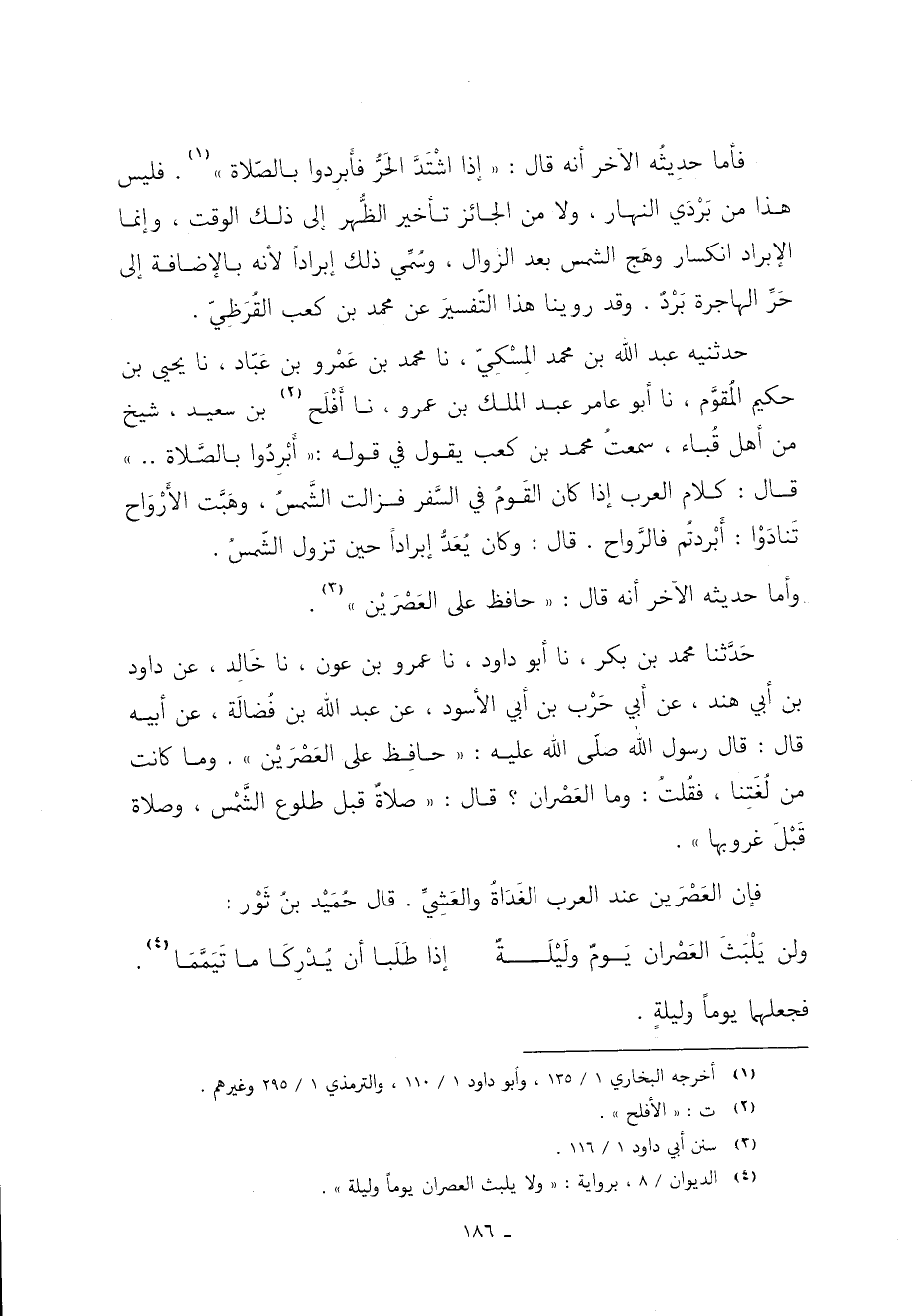 حَدَّثَنِيهِ عَبْدُ اللَّهِ بْنُ مُحَمَّدٍ الْمِسْكِيُّ نا مُحَمَّدُ بْنُ عَمْرِو بْنِ عَبَّادٍ نا يَحْيَى بْنُ حَكِيمٍ الْمُقَوَّمُ نا أَبُو عَامِرٍ عَبْدُ الْمَلِكِ بْنُ عَمْرٍو نا أَفْلَحُ 2 بْنُ سَعِيدٍ شَيْخٌ مِنْ أَهْلِ قُبَاءٍ سَمِعْتُ مُحَمَّدَ بْنَ كَعْبٍ يَقُولُ فِي قَوْلِهِ: "أَبْرِدُوا بِالصَّلاةِ" قَالَ كلام العرب إذا كان القَومُ في السَّفر فزالت الشَّمسُ وهَبَّت الأَرْوَاح تَنادَوْا أَبْردتُم فالرَّواح