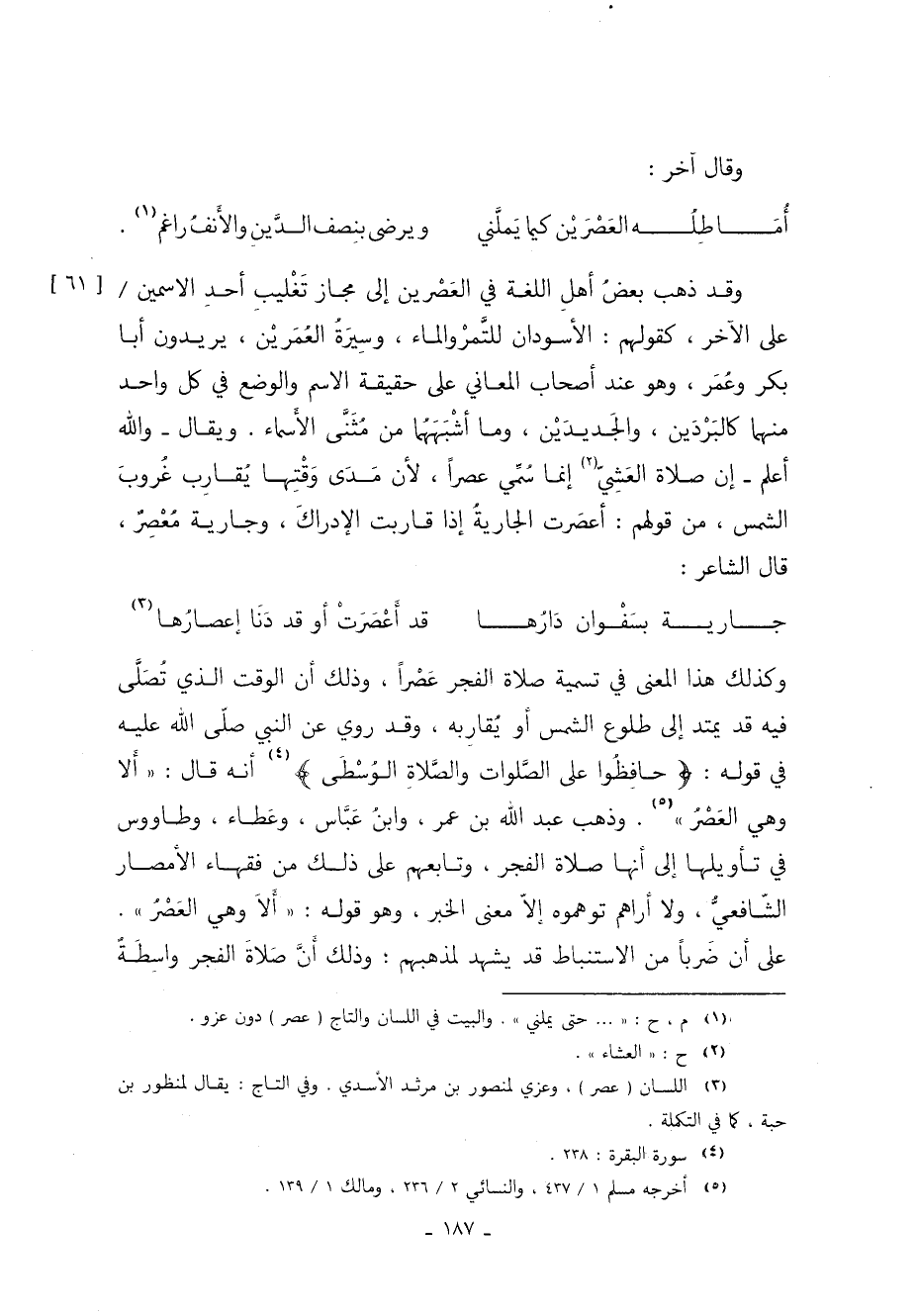 وكذلك هذا المعنى في تسمية صلاة الفجر عَصْرًا وذلك أن الوقت الَّذِي تُصَلَّى فيه قد يمتد إلى طلوع الشمس أو يُقارِبه وقد روي عن النَّبِيّ صَلَّى اللَّهُ عَلَيْهِ وَسَلَّمَ في قوله: {حَافِظُوا عَلَى الصَّلَوَاتِ وَالصَّلاةِ الْوُسْطَى} 4 أنه قَالَ: "أَلا وهي العَصْرُ" 5 وذهب عبد الله بن عمر وابن عباس وعطاء وطاووس في تأويلها إلى أنها صلاة الفجر وتابعهم عَلَى ذَلِكَ من فقهاء الأمصار الشّافعيُّ ولا أراهم توهموه إلا معنى الخبر وهو قوله: "أَلا وهي العَصْرُ" عَلَى أن ضَربًا من الاستنباط قد يشهد لمذهبهم وذلك أَنَّ صَلاةَ الفجر واسِطَةٌ