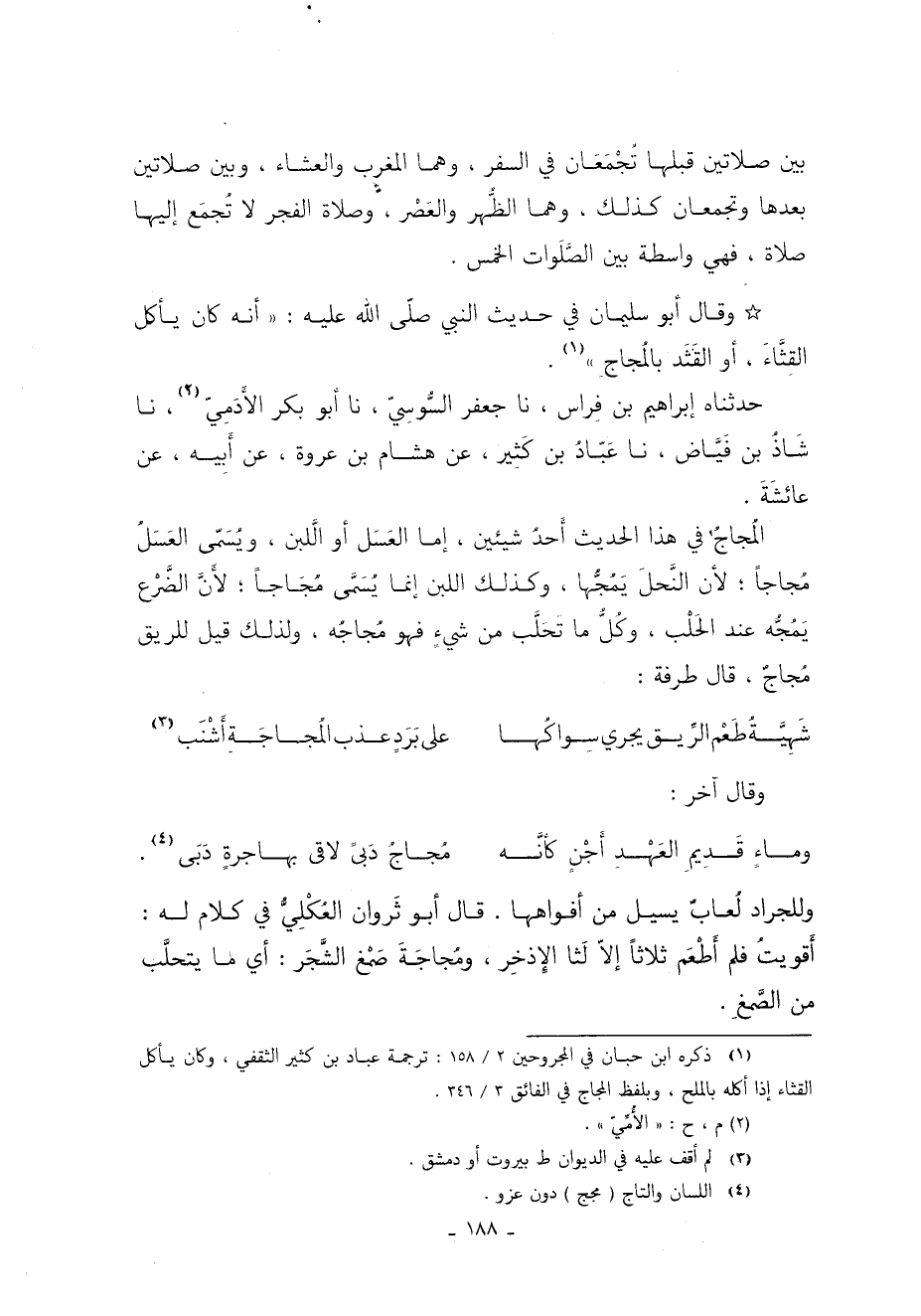 1 ذكره ابن حبان في المجروحين 2/ 158: ترجمة عباد بن كثير , وكان يأكل القثاء إذا أكله بالملح, وبلفظ المجاج في الفائق 3/ 346