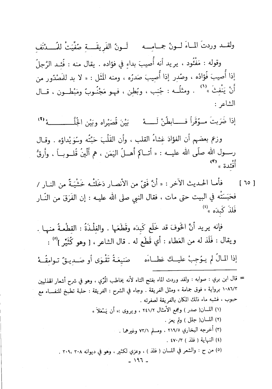 وقوله: مَفْئُود يريد أنه أُصيبَ بداءٍ في فؤاده يقال منه فُئِد الرَّجلُ إذا أُصيبَ فُؤادُه وصُدِر إذا أُصِيبَ صَدرُه ومنه المَثَل لا بد للمَصْدُور من أَنْ يَنْفِثَ 1 ومثلُه جُنِب وبُطِن فهو مَجْنُوبٌ ومَبْطون قَالَ الشاعر: