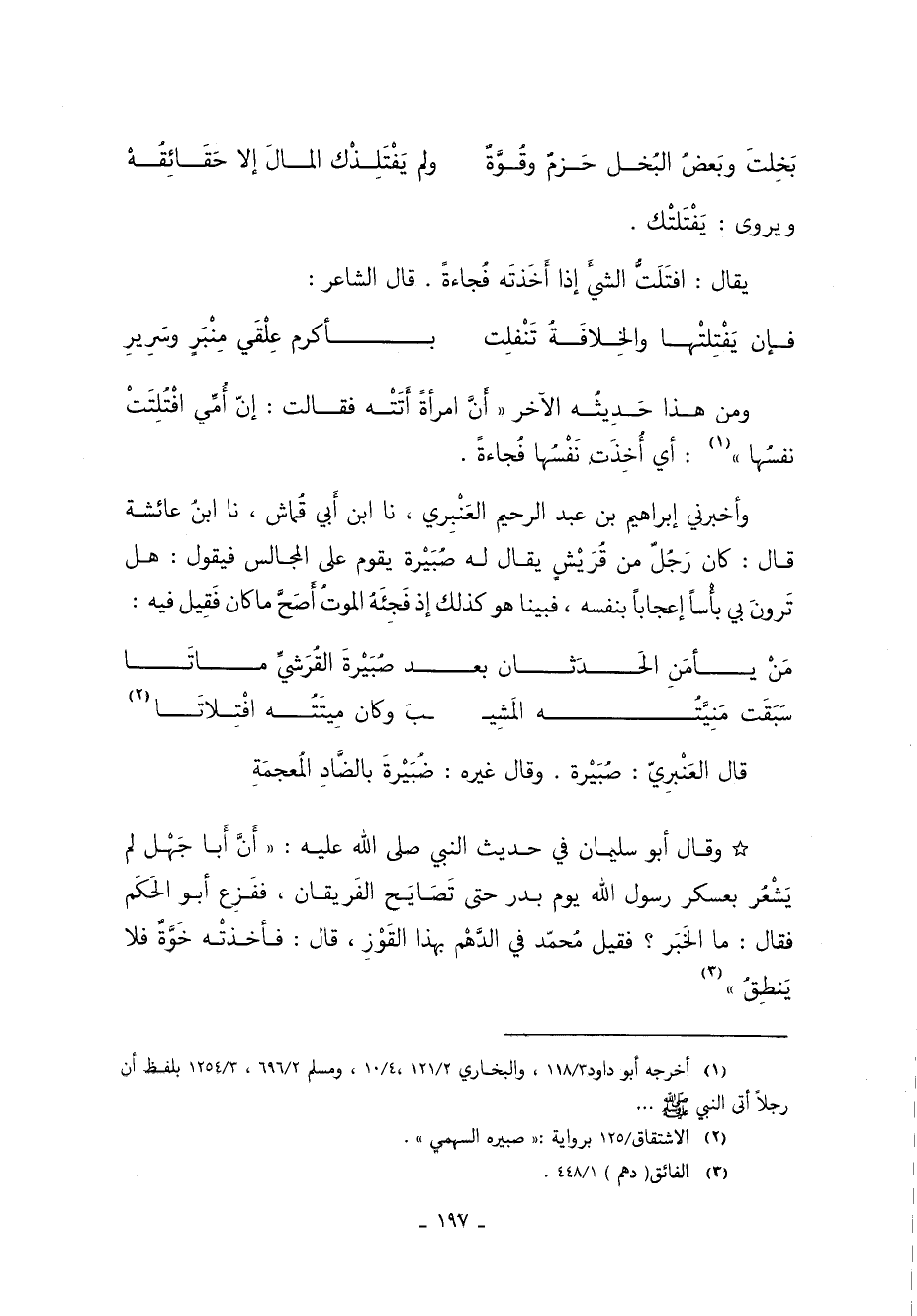 وَمِنْ هَذَا حَدِيثُهُ الآخَرُ: "أَنَّ امْرَأَةً أَتَتْهُ فَقَالَتْ إِنَّ أُمِّي افْتُلِتَتْ نَفْسُهَا"1: أَيْ أُخِذَتْ نَفْسُهَا فُجَاءَةً