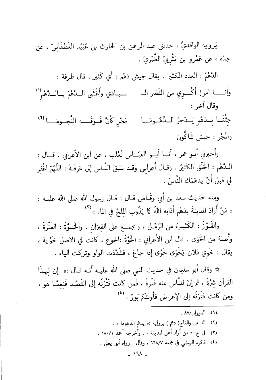 وَمِنْهُ حَدِيثُ سَعْدِ بْنِ أَبِي وَقَّاصٍ قَالَ قَالَ رَسُولُ الله النَّبِيِّ صَلَّى اللَّهُ عَلَيْهِ وَسَلَّمَ: "مَنْ أَرَادَ الْمَدِينَةَ بِدَهْمٍ أَذَابَهُ اللَّهُ كَمَا يَذُوبُ الْمِلْحُ فِي الْمَاءِ" 3