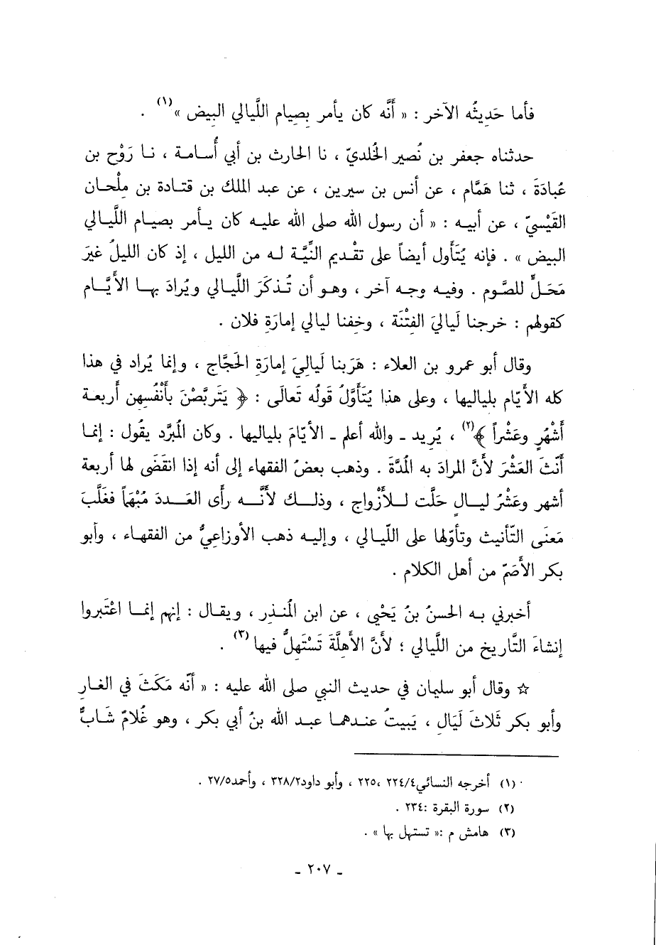 حَدَّثَنَاهُ جَعْفَرُ بْنُ نُصَيْرٍ الْخُلْدِيُّ نا الْحَارِثُ بْنُ أَبِي أُسَامَةَ نا رَوْحُ بْنُ عُبَادَةَ ثنا هَمَّامٌ عَنْ أَنَسِ بْنِ سِيرِينَ عَنْ عَبْدِ الْمَلِكِ بْنِ قَتَادَةَ بْنِ مِلْحَانَ الْقَيْسِيِّ عَنْ أَبِيهِ: "أَنَّ رَسُولُ اللَّهِ صَلَّى اللَّهُ عَلَيْهِ وَسَلَّمَ كَانَ يَأْمُرُ بِصِيَامِ اللَّيَالِي الْبِيضِ" فإنه يُتَأَول أيضًا عَلَى تقْديم النِّيَّة له من الليل إذ كان الليلُ غيرَ مَحَلٍّ للصَّوم وفيه وجه آخر وهو أن تُذكَرَ اللَّيالي ويُرادَ بها الأَيَّام كقولهم خرجنا لَياليَ الفِتْنَة وخِفنا ليالي إمارَةِ فلان