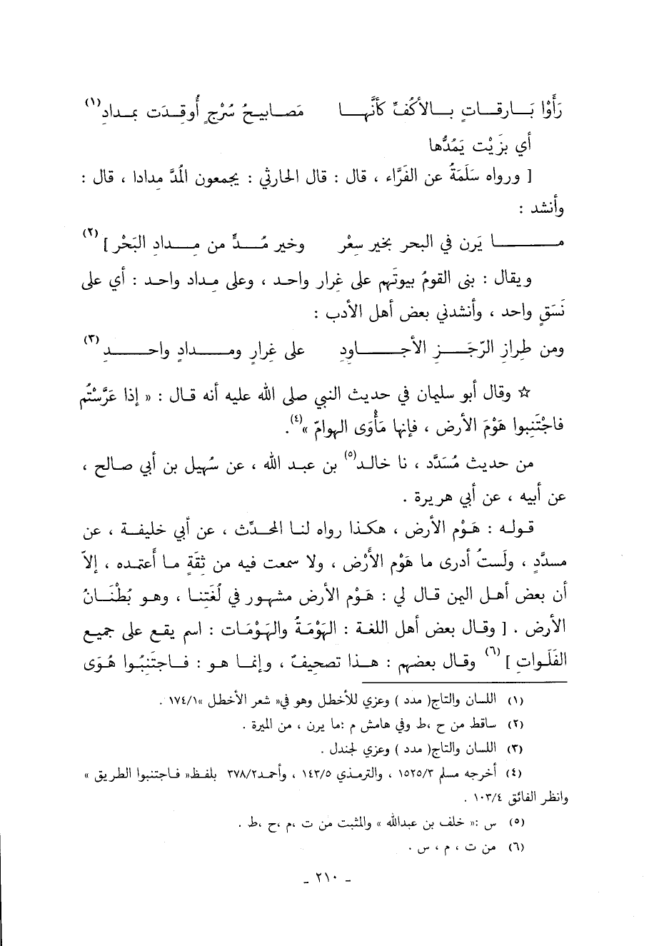 قوله: هَوْم الأرض هكذا رواه لنا المحدِّث عن أبي خليفة عن مسدَّدٍ ولَستُ أدري ما هَوْم الأَرْض ولا سمعت فيه من ثِقَةٍ ما أَعتمده إلا أن بعض أهل اليمن قَالَ لي هَوْم الأَرْض مشهور في لُغَتِنا وهو بُطْنَانُ الأرض وقال بعض أهل اللغة الهَوْمَةُ والهَوْمَات اسم يقع عَلَى جميع الفَلَواتِ 3 وقال بعضهم هذا تصحِيفٌ وإنما هُوَ فاجتَنِبُوا هوى