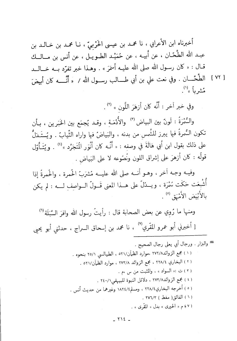 أَخْبَرَنَاهُ ابْنُ الأَعْرَابِيِّ نا مُحَمَّدُ بْنُ عِيسَى الْحَرْبِيُّ نا مُحَمَّدُ بْنُ خَالِدِ بْنِ عَبْدِ اللَّهِ الطَّحَّانُ عَنْ أَبِيهِ عَنْ حُمَيْدٍ الطَّوِيلِ عَنْ أَنَسِ بْنِ مَالِكٍ قَالَ: "كَانَ رَسُولُ اللَّهِ صَلَّى اللَّهُ عَلَيْهِ وَسَلَّمَ أَسْمَرَ". وَهَذَا خَبَرٌ تَفَرَّدَ بِهِ خَالِدٌ الطَّحَّانُ وَفِي نَعْتِ عَلِيِّ بْنِ أَبِي طالب رسول الله "أَنَّهُ كَانَ أَبْيَضَ مُشْرَبًا"1.