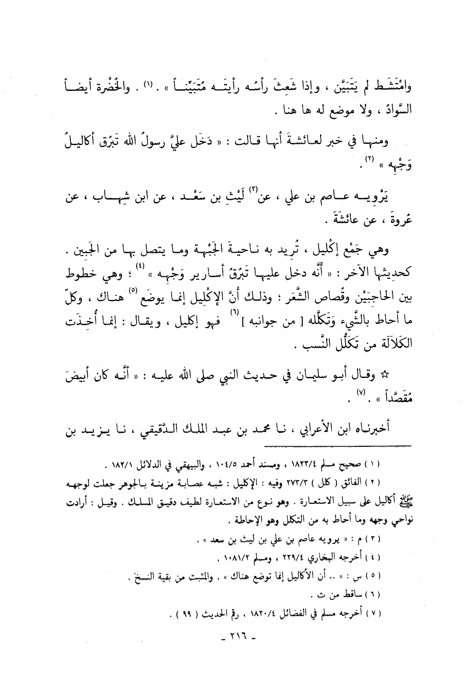 2 الفائق "كلل" 3/ 273, وفيه: الإكليل: شبه عصابة مزينة بالجوهر جعلت لوجهه صلى الله عليه وسلم آكاليل على سبيل الاستعارة. وهو نوع من الاستعارة. لطيف دقيق المسلك. وقيل: أردت نواحي وجهه وما أحاط به من التكلل وهو الإحاطة.