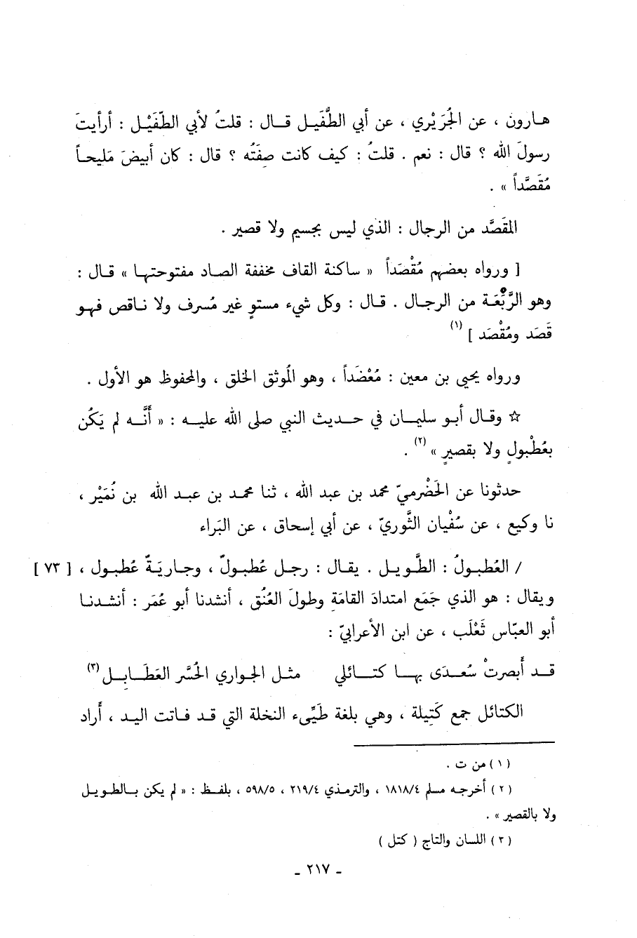 هَارُونَ عَنِ الْجُرَيْرِيِّ عَنْ أَبِي الطُّفَيْلِ قَالَ: قُلْتُ لأَبِي الطُّفَيْلِ: أرأيت رسول الله؟ ققال نَعَمْ قُلْتُ كَيْفَ كَانَتْ صِفَتُهُ قَالَ كَانَ أَبْيَضَ مَلِيحًا مُقَصَّدًا"