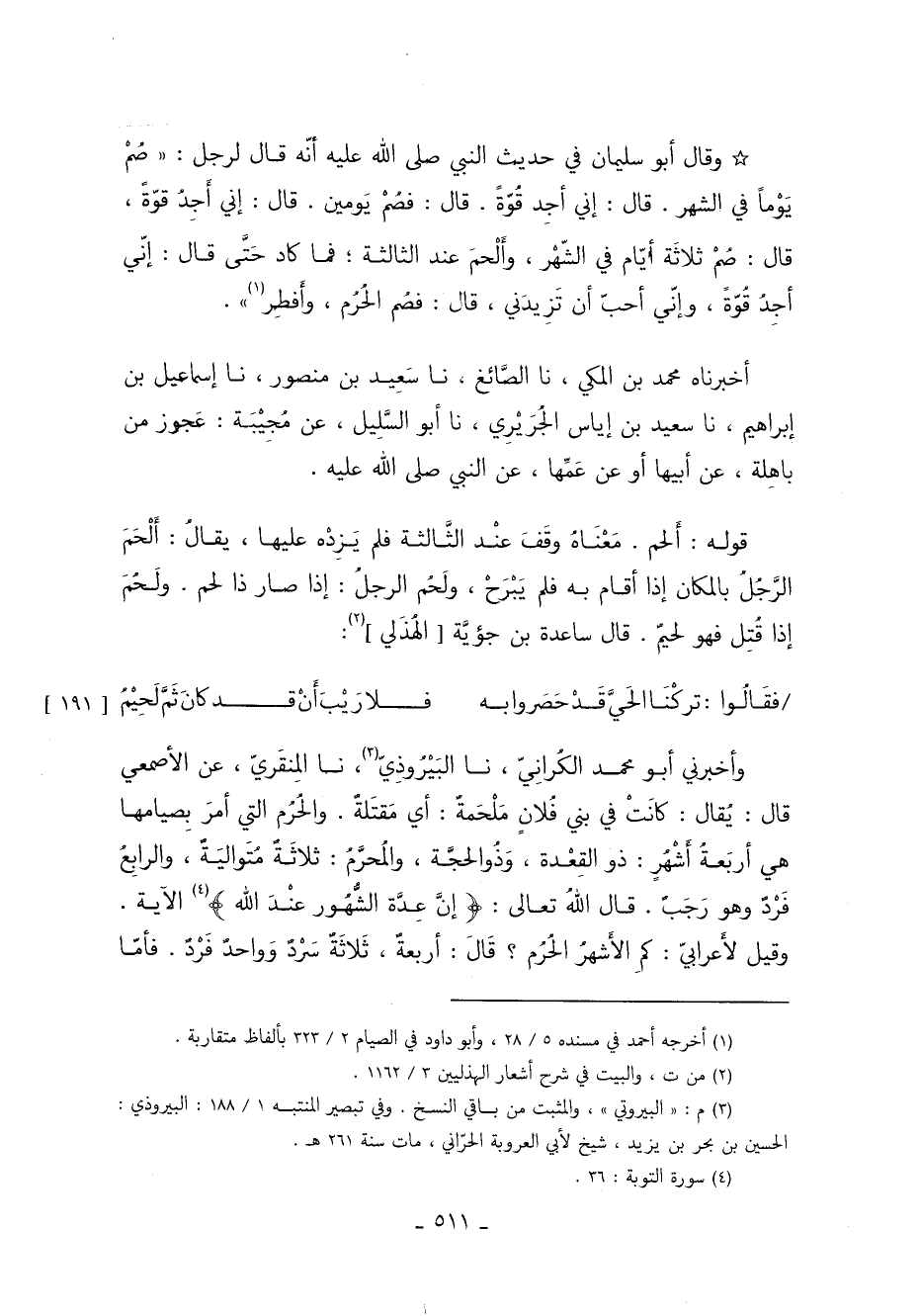 وأخبرني أبو محمد الكُرانِيّ نا البَيْرُوذِي 3 نا المِنقَريّ عَنِ الأصمعي قَالَ يُقال كانَتْ في بني فُلانٍ مَلْحَمةٌ أي مَقتَلةٌ. والحُرُم التي أمرَ بِصيامها هي أربَعةُ أَشْهُرٍ ذو القَعْدة وَذُو الحجَّة والمُحرَّمُ ثلاثَةٌ مُتَواليَةٌ والرابعُ فَرْدٌ وهو رَجَبٌ قَالَ اللهُ تَعَالَى: {إِنَّ عِدَّةَ الشُّهُورِ عِنْدَ اللَّهِ} 4. الآية. قيل لأَعرابيّ: كمِ الأَشهرُ الحُرُم قَالَ أربعةٌ ثَلاثَةٌ سَرْدٌ وَواحدٌ فَرْدٌ. فأما