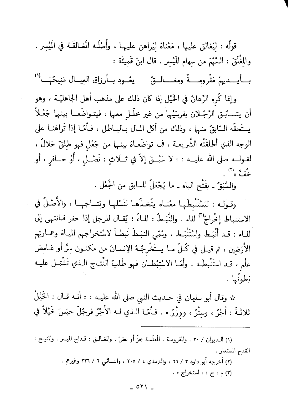 وإنما كُرِه الرِّهانُ في الخَيْل إذَا كَانَ ذَلِكَ عَلَى مذهب أهل الجاهليّة وهو أن يتسابَق الرِّجُلان بفرسَيْهما من غير محلّلٍ معهما فيتواضَعا بينهما جُعْلًا يستَحقّه السّابقُ منهما وذلك من أكل المال بالباطل فأمّا إذَا تَراهَنا عَلَى الوجه الَّذِي أطلقَتْه الشَّريعة فَما تواضَعاهُ بينهما من جُعْلٍ فهو طِلقٌ حَلالٌ لقوله صَلَّى اللَّهُ عَلَيْهِ وَسَلَّمَ: "لا سَبْقَ إلّا في ثلاثٍ نَصْلٍ أَوْ حافرٍ أو خُفٍّ" 2.