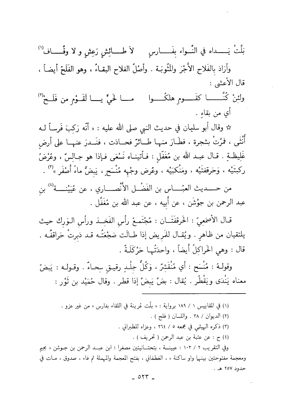وأرَادَ بِالفَلاح الأَجْرَ والمَثُوبَة. وأَصْلُ الفلاح البقاءُ وهو الفَلَحُ أيضًا. قَالَ الأعشى:
