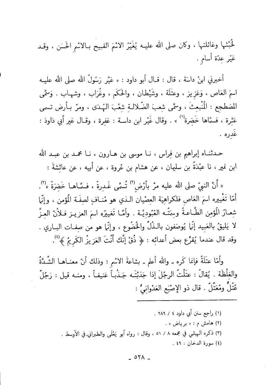 أخبرني ابنُ داسَة قَالَ قَالَ أبو داود غيَّر رَسُولُ اللَّهِ صَلَّى اللَّهُ عَلَيْهِ وَسَلَّمَ اسمَ العَاص وَعَزِيز وعتَلَة وشَيْطان والحَكَم وغُرَاب وشهاب. وَسمَّى المضطجِع المُنْبِعثَ وسمَّى شِعبَ الضّلالةِ شِعْبَ الهُدَى ومرّ بأرض تسمى عَثِرة فسمّاها خَضِرة 1. وقال غَيْر ابن داسة: عَفِرة وقال غير أَبِي دَاودَ غَدِره.