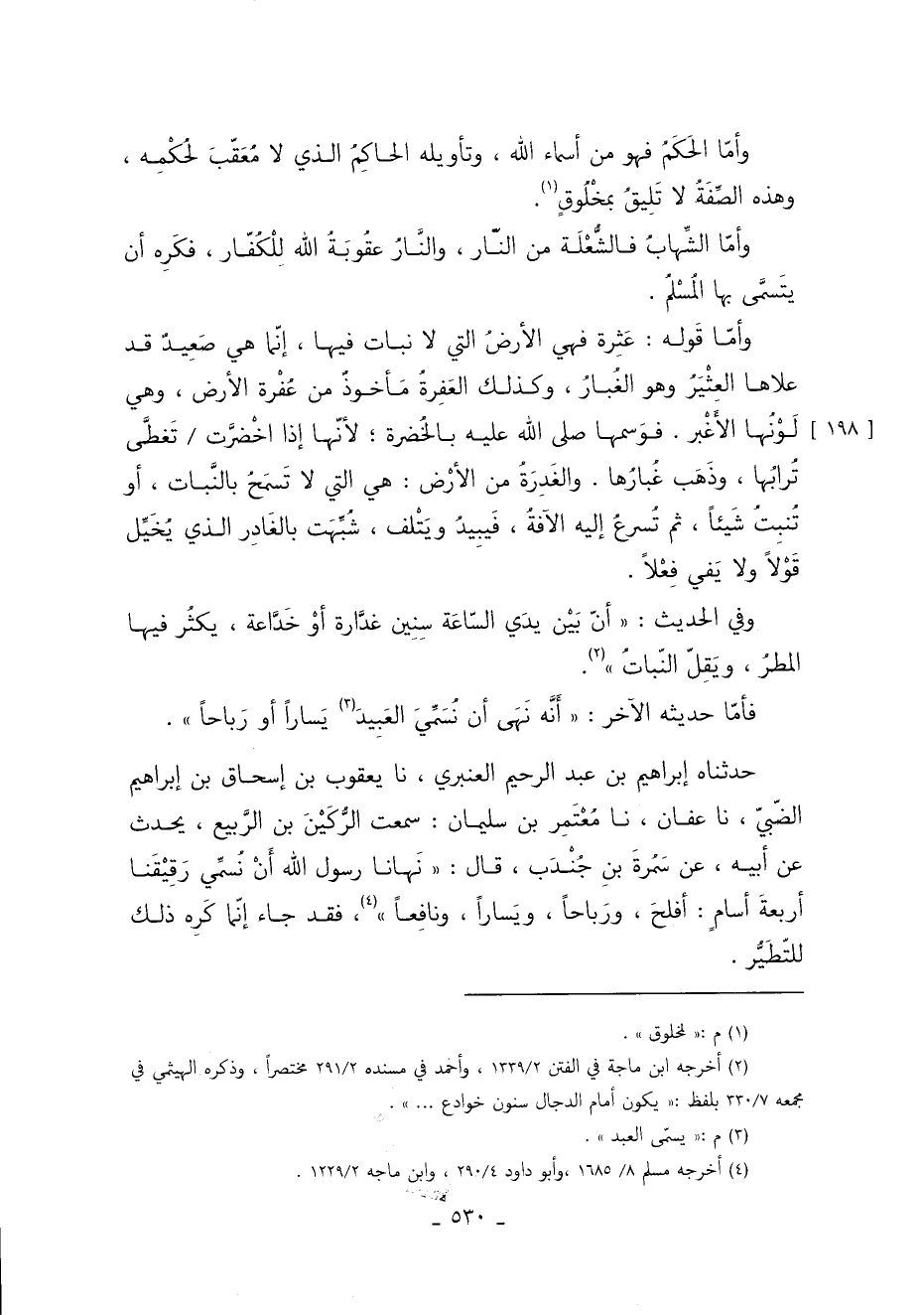 حَدَّثَنَاهُ إِبْرَاهِيمُ بْنُ عَبْدِ الرَّحِيمِ الْعَنْبَرِيُّ نا يَعْقُوبُ بْنُ إِسْحَاقَ بْنِ إِبْرَاهِيمَ الضَّبِّيُّ نا عَفَّانُ نا مُعْتَمِرُ بْنُ سُلَيْمَانَ سَمِعْتُ الرُّكَيْنَ بْنَ الرَّبِيعِ يُحَدِّثُ عَنْ أَبِيهِ عَنْ سَمُرَةَ بْنِ جُنْدَبٍ قَالَ: نَهَانَا رَسُولُ اللَّهِ أَنْ نُسَمِّيَ رَقِيقَنَا أَرْبَعَةَ أَسَامٍ أَفْلَحَ وَرَبَاحًا وَيَسَارًا وَنَافِعًا 4 فَقَدْ جَاءَ إِنَّمَا كره ذلك للتطير.