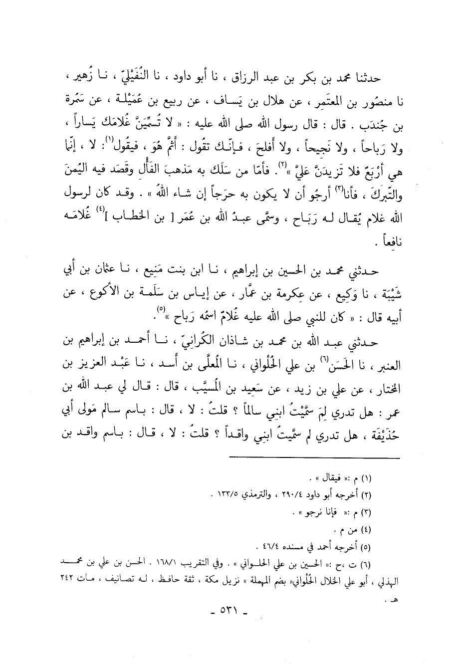 حَدَّثَنَا مُحَمَّدُ بْنُ بَكْرِ بْنِ عَبْد الرزاق نا أبو داود نا النُّفَيْلِيُّ نا زُهَيْرٌ نا مَنْصُورُ بْنُ الْمُعْتَمِرِ عَنْ هِلالِ بْنِ يَسَافٍ عَنْ رَبِيعِ بْنِ عُمَيْلَةَ عَنْ سَمُرَةَ بْنِ جُنْدَبٍ. قَالَ قَالَ رَسُولُ اللَّهِ صَلَّى اللَّهُ عَلَيْهِ وَسَلَّمَ: "لا تُسَمِّيَنَّ غُلامَكَ يَسَارًا وَلا رَبَاحًا وَلا نَجِيحًا وَلا أَفْلَحَ فَإِنَّكَ تَقُولُ أَثَّمَ هُوَ فَيَقُولُ 1: لا إِنَّمَا هِيَ أَرْبَعٌ فَلا تَزِيدَنَّ عَلَيَّ" 2. فَأَمَّا مَنْ سَلَكَ بِهِ مَذْهَبَ الْفَأْلِ وَقَصَدَ فِيهِ الْيُمْنَ وَالتَّبَرُّكَ فَأَنَا 3 أَرْجُو أَنْ لا يَكُونَ بِهِ حَرَجًا إِنْ شَاءَ اللَّهُ. وَقَدْ كَانَ لِرَسُولِ اللَّهِ غُلامٌ يُقَالُ: لَهُ رَبَاحٌ وَسَمَّى عَبْدُ اللَّهِ بْنُ عُمَرَ بْنِ الْخَطَّابِ 4 غُلامَهُ نَافِعًا.