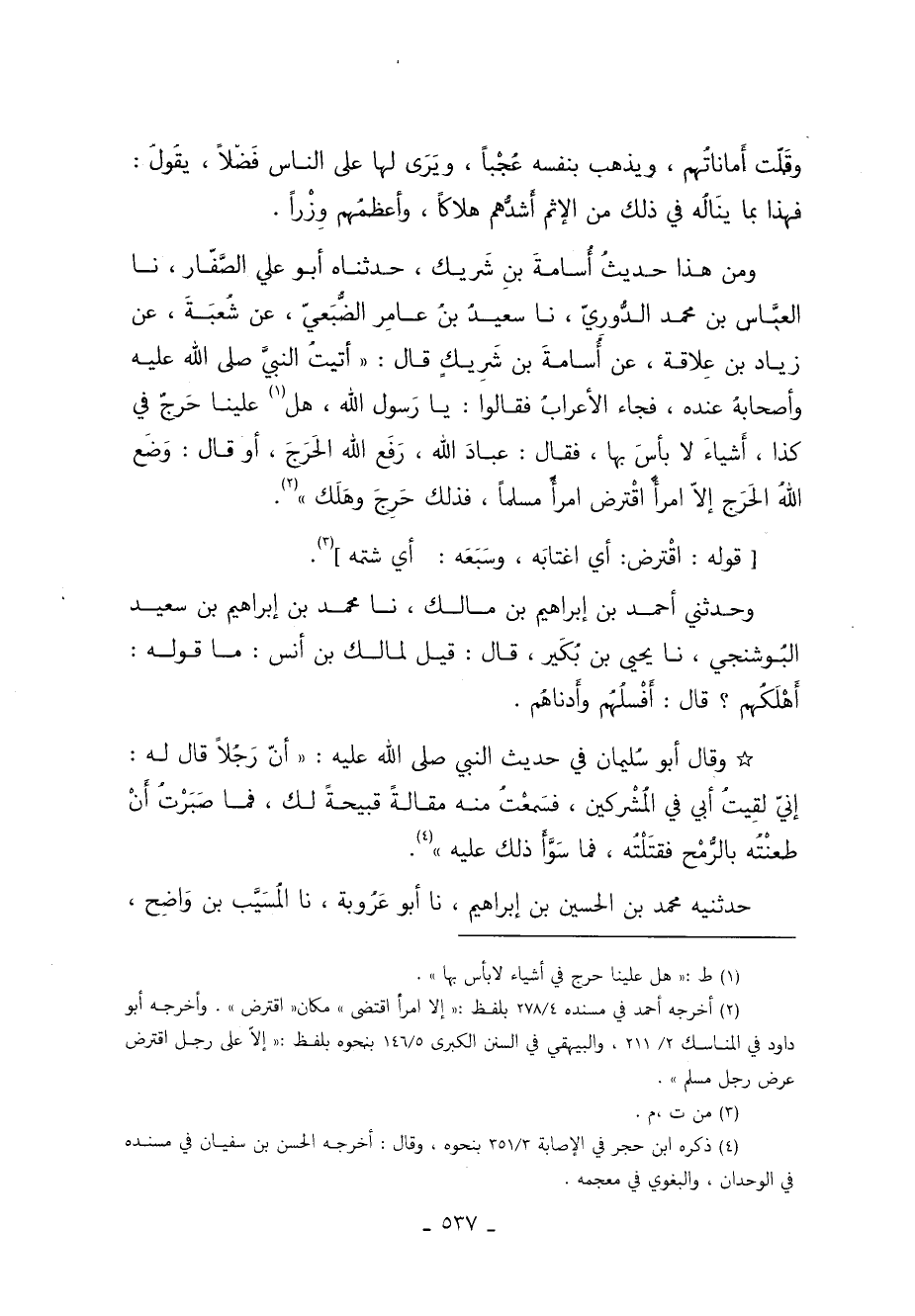 ومن هذا الحديث أُسَامَةَ بْنِ شَرِيكٍ حَدَّثَنَاهُ أَبُو عَلِيٍّ الصَّفَّارُ نا الْعَبَّاسُ بْنُ مُحَمَّدٍ الدُّورِيُّ نا سَعِيدُ بْنُ عَامِرٍ الضُّبَعِيُّ عَنْ شُعْبَةَ عَنْ زِيَادِ بْنِ عِلاقَةَ عَنْ أُسَامَةَ بْنِ شَرِيكٍ قَالَ: أَتَيْتُ النَّبِيَّ وَأَصْحَابُهُ عِنْدَهُ فَجَاءَ الأَعْرَابُ فَقَالُوا: يَا رَسُولَ اللَّهِ هَلْ 1 عَلَيْنَا حَرَجٌ فِي كَذَا أَشْيَاءَ لا بَأْسَ بِهَا فَقَالَ: "عِبَادَ اللَّهِ رَفَعَ اللَّهُ الْحَرَجَ" أَوْ قَالَ: "وَضَعَ اللَّهُ الْحَرَجَ إِلا امْرَأً اقْتَرَضَ امْرَأً مُسْلِمًا فَذَلِكَ حَرِجَ وَهَلَكَ" 2.