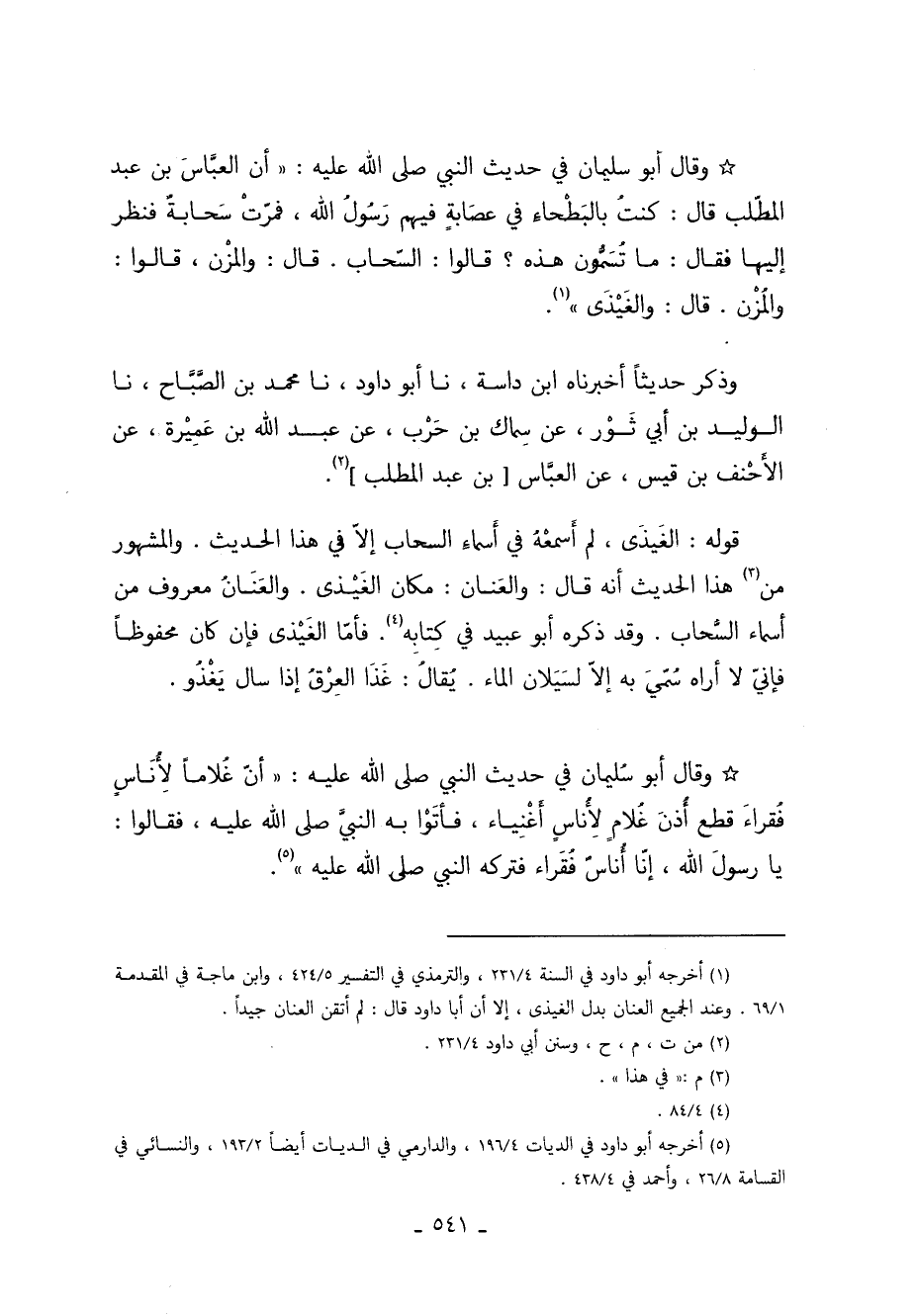 وَقَالَ أَبُو سُلَيْمَانَ فِي حَدِيثِ النَّبِيِّ صَلَّى اللَّهُ عَلَيْهِ وَسَلَّمَ: أَنَّ الْعَبَّاسَ بْنَ عَبْدِ الْمُطَّلِبِ قَالَ: كُنْتُ بِالْبَطْحَاءِ فِي عِصَابَةٍ فيهم رسول الله فَمَرَّتْ سَحَابَةٌ فَنَظَرَ إِلَيْهَا فَقَالَ: "مَا تُسَمُّونَ هَذِهِ" قَالُوا السَّحَابُ. قَالَ: "وَالْمُزْنُ" قَالُوا: وَالْمُزْنُ. قَالَ: "وَالْغَيْذَى" 1.