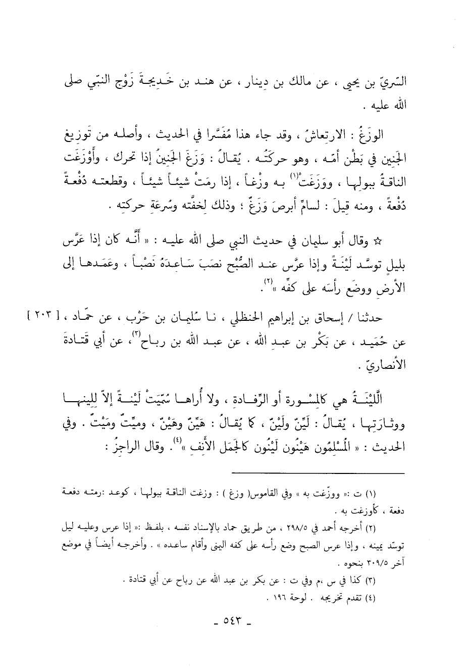 وَقَالَ أَبُو سُلَيْمَانَ فِي حَدِيثِ النَّبِيِّ صَلَّى اللَّهُ عَلَيْهِ وَسَلَّمَ: أَنَّهُ كَانَ إِذَا عَرَّسَ بِلَيْلٍ تَوَسَّدَ لَيْنَةً وَإِذَا عَرَّسَ عِنْدَ الصُّبْحِ نَصَبَ سَاعِدَهُ نَصْبًا وَعَمَدَهَا إِلَى الأرْضِ وَوَضَعَ رَأْسَهُ عَلَى كَفِّهِ 1.