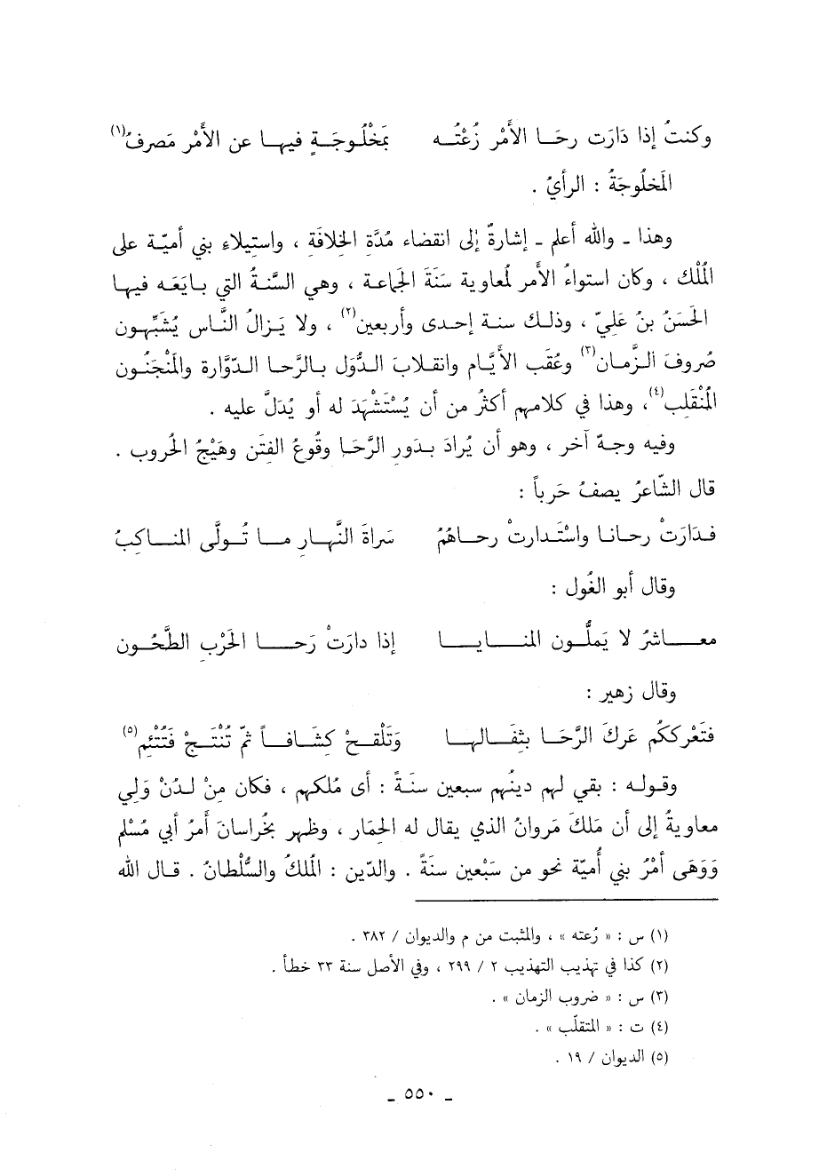 وهذا والله أعلم إشارةٌ إلى انقضاء مُدَّةِ الخِلافَةِ واستِيلاء بني أميّة عَلَى المُلْك وكان استواءُ الأَمر لمُعاوية سَنَةَ الْجَماعة وهي السَّنةُ التي بايَعَه فيها الحَسَنُ بنُ عَلِيّ وذلك سنة إحدى وأربعين 2 ولا يَزالُ النَّاس يُشَبِّهون صُروفَ الزَّمان 3 وعُقَب الأَيَّام وانقلابَ الدُّوَل بالرَّحا الدّوَّارة والمَنْجَنُون المُنْقَلِب 4 وهذا في كلامهم أكثُر من أن يُسْتَشْهَدَ لَهُ أو يُدَلَّ عَلَيْهِ.