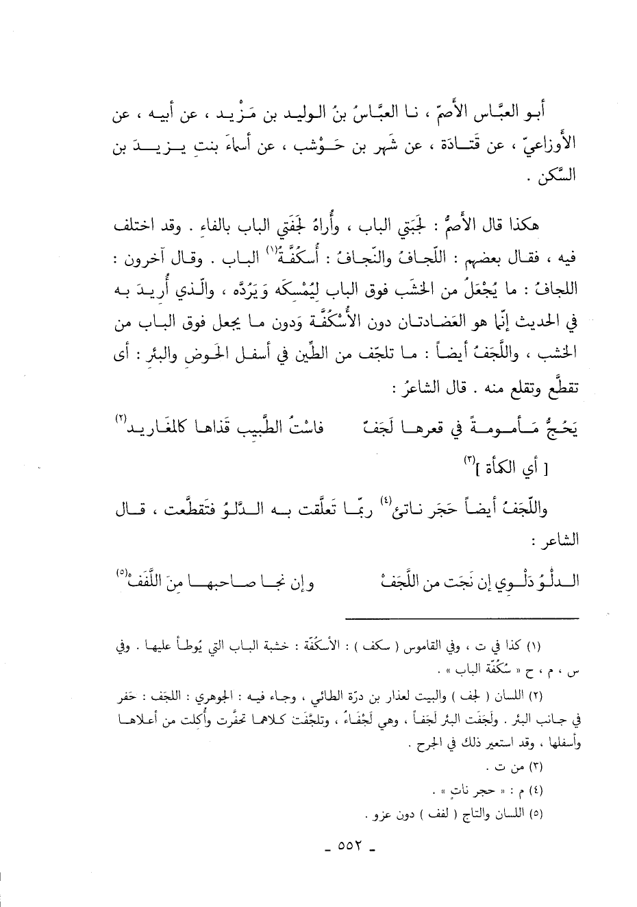 هَكَذَا قَالَ الأَصَمُّ: لَجْبَتَيِ الْبَابِ وَأُرَاهُ لَجْفَتَيِ الْبَابِ بِالْفَاءِ. وقد اختلف فيه فَقَالَ بعضهم اللّجاف والنّجافُ أُسكُفَّهُ 1 الباب. وقال آخرون: اللجافُ ما يُجْعَلُ من الخشَب فوق الباب لِيُمْسِكَهُ وَيَرُدَّه والّذي أُرِيدَ بِهِ في الحديث إنّما هُوَ العَضادتان دون الأسْكُفَّة وَدون ما يجعل فوق الباب من الخشب واللَّجَفُ أيضًا ما تلجّف من الطِّين في أسفل الحَوضِ والبئرِ أي تقطَّع وتقلع منه. قَالَ الشاعرُ: