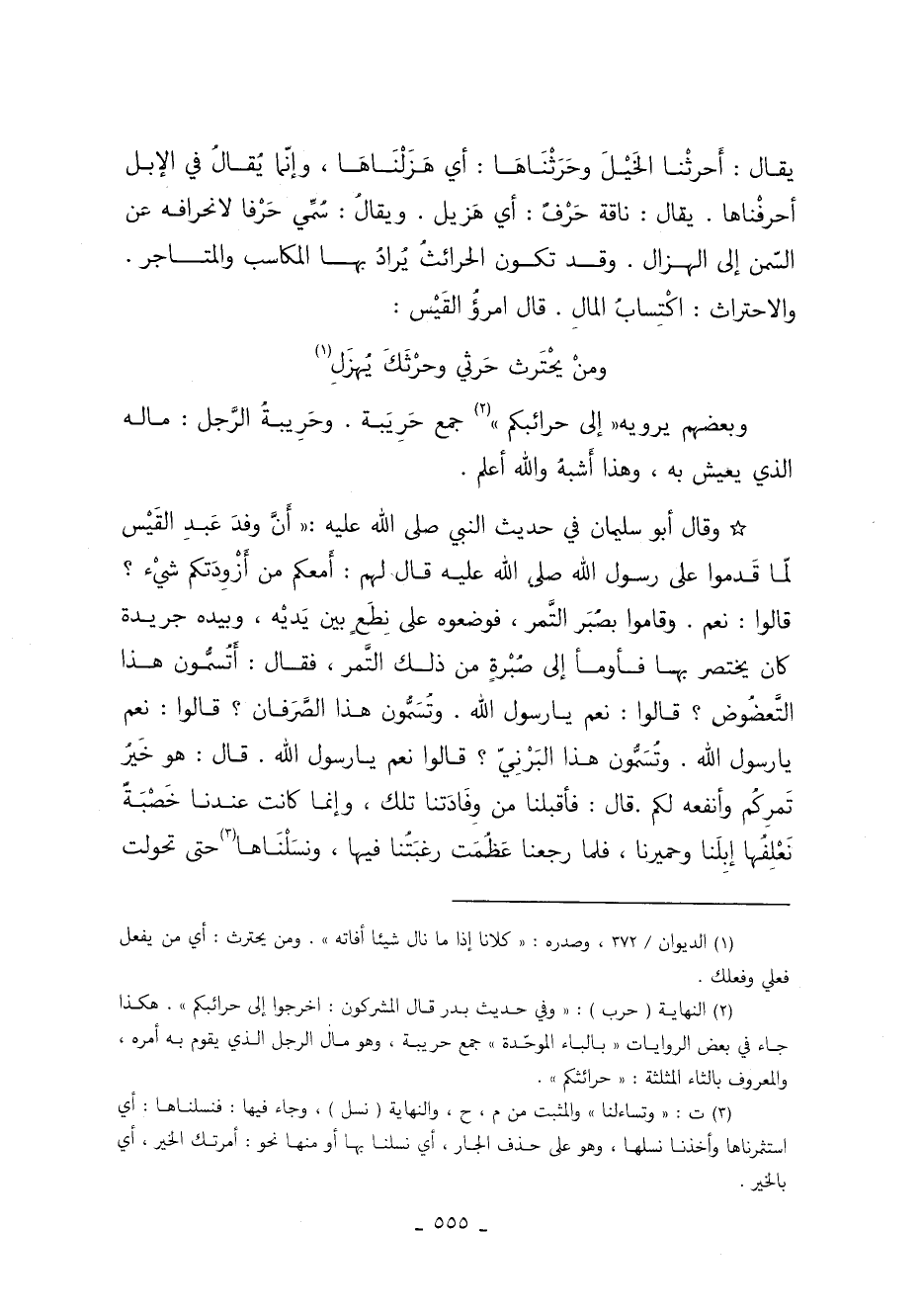 2 النهاية حرب: وفي حديث بدر قال المشركون: اخرجوا إلى حرائبكم هكذا جاء في بعض الروايات بالباء الموحدة جمع حريبة وهو مال الرجل الذي يقوم به بأمره والمعروف بالثاء المثلثة: "حرائثكم".