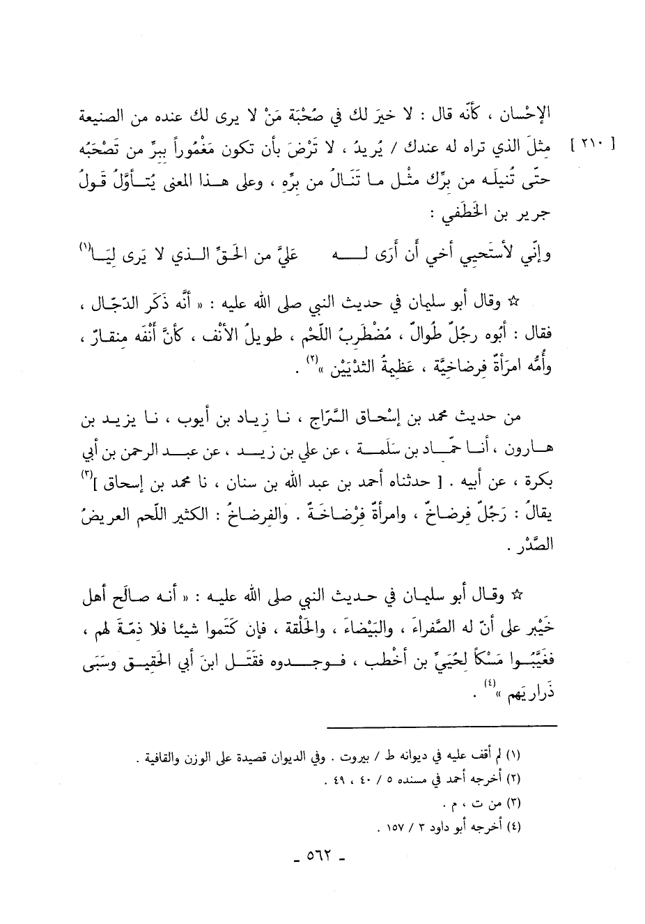 الإحْسان كأنّه قَالَ: لا خيرَ لك في صُحْبَة مَنْ لا يرى لك عنده من الصنيعة مِثَل الَّذِي تراه لَهُ عندك يُريدُ لا تَرْضَ بأن تكون مَغْمُورًا بِبِرِّ من تَصْحَبُه حتّى تُنيلَه من بِرِّك مثْل ما تَنَالُ من بِرِّهِ وعلى هذا المعنى يُتأوَّلُ قَولُ جرير بْن الْخَطَفي: