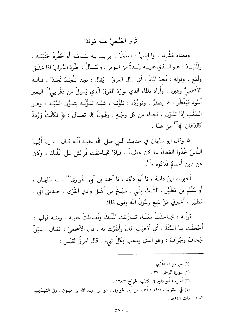 ومعناه مُشْرِفا. والخِدَبُّ الضّخْمُ يريد بِهِ سَنامَه أو جُفْرةَ جَنْبَيْه. والمُلبِدُ هُوَ الَّذِي عَلَيْهِ لِبْدةٌ من الوَبَر. ويُقالُ اطّردَ السَّرابُ إذَا خَفَق ولَمَع. وقوله: نَجِدَ الماءُ أي سال العَرقُ. يُقال نَجِدَ يَنْجَدُ نَجَدًا قاله الأصمعيُّ وغيره وأراد بالماء الَّذِي تورّدَ العَرقَ الّذي يَسيلُ من ذِفْرَيَيِ 1 البَعِير أسْود فيَقْطُر ثُمَّ يصفَرُّ وتورُّدُه تلونه شبه تلونه بتلون السِّيد وهو الذئْب إذَا تلوّن فجاء من كل وَجْه. وقَولُ الله تَعَالَى: {فَكَانَتْ وَرْدَةً كَالدِّهَانِ} 2 من هذا.