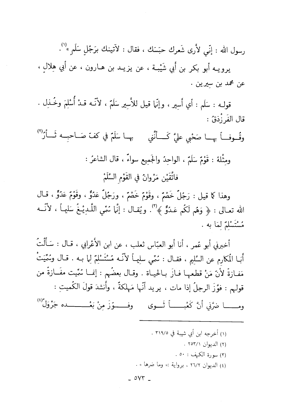 وهذا كما قِيلَ: رَجُلٌ خَصْمٌ وقَوْمٌ خَصْمٌ ورَجُلٌ عَدُوٌّ وقَوْمٌ عَدُوٌّ قَالَ الله تَعَالَى: {وَهُمْ لَكُمْ عَدُوٌّ} 3. ويُقال: إنَّما سُمِّي اللَّدِيغُ سَليمًا لأنّه مُسْتَسْلِم لِمَا بِهِ.
