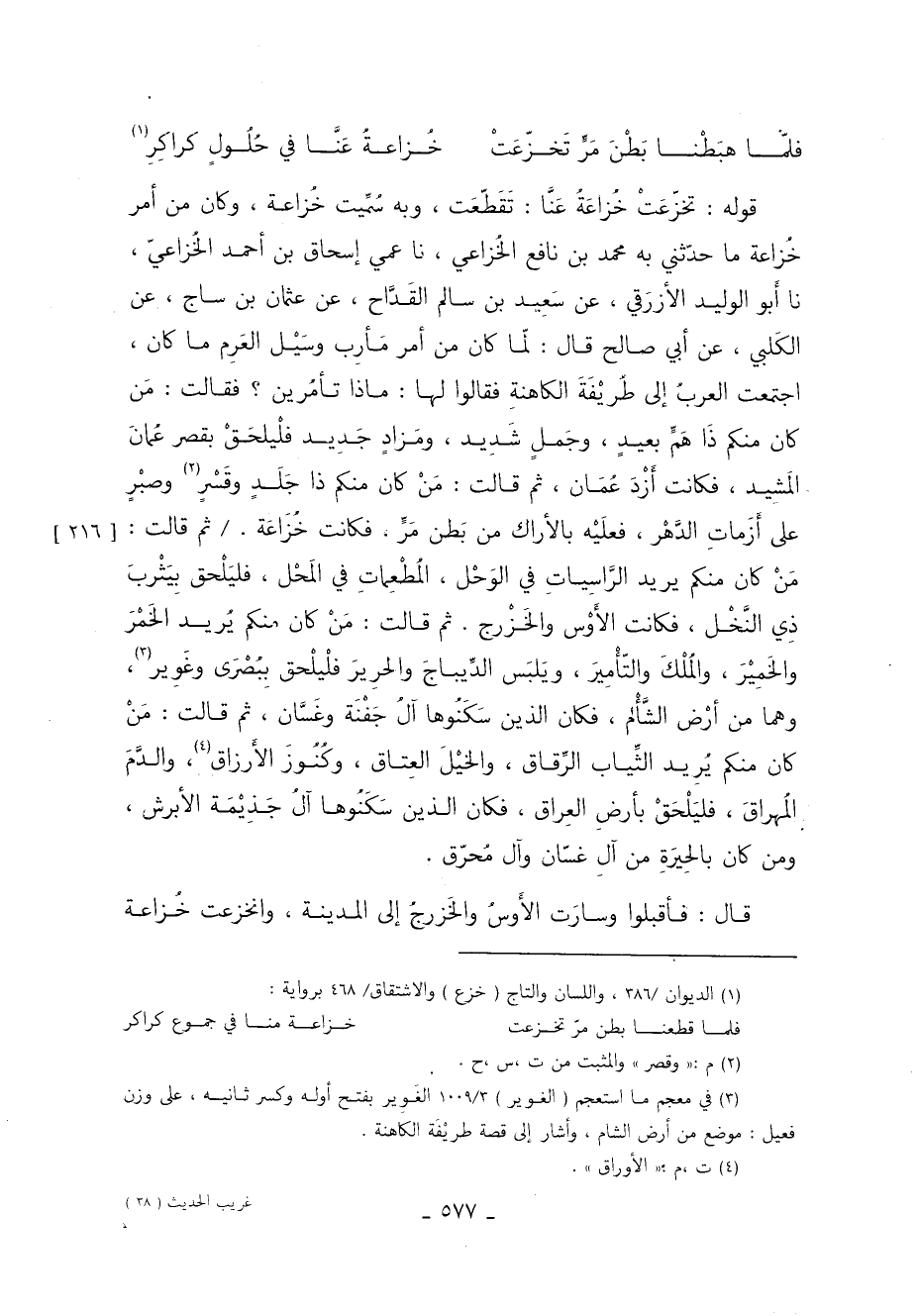 قوله: تخزّعَتْ خُزاعَةُ عَنَّا تَقَطّعَت وبه سُمِّيت خُزاعة وكان من أمر خزاعة ما حدَّثَنِي بِهِ محمد بْن نافع الخزاعي نا عمي إِسْحَاق بْن أَحْمَد الخزاعي نا أَبو الوليد الأزرَقي عَنْ سَعِيد بْن سالم القَدَّاح عَنْ عثمان بْن ساج عَنِ الكَلبي عَنْ أَبِي صالح قَالَ لمّا كَانَ من أمر مَأرِب وسَيْل العَرِم ما كَانَ اجتمعت العربُ إلى طُريْفَةَ الكاهنةِ فقالوا لها ماذا تأمُرين فقالت مَن كَانَ منكم ذَا هَمٍّ بعيدٍ وجَملٍ شَدِيد ومَزادٍ جَدِيد فلْيلحَقْ بقصر عُمانَ المَشِيد فكانت أَزْدَ عُمَان ثُمَّ قالت مَنْ كَانَ منكم ذا جَلَد وقَسْرٍ 2 وصبْرٍ عَلَى أزمات الدَّهْر فعلَيْه بالأراك من بَطن مَرٍّ فكانت خُزَاعَة. ثُمَّ قالت مَنْ كَانَ منكم يريد الرَّاسِياتِ في الوَحْل المُطْعمِاتِ في المَحْل فليَلْحق بَيَثْربَ ذي النخل فكانت الأوس والخزرج. ثُمَّ قَالَتْ من كَانَ منكم يريد الخمر والخَمِيرَ والمُلْكَ والتّأمِيرَ ويَلبَس الدِّيباجَ والحرِيرَ فلْيلْحق بِبُصْرَى وغَوِير 3 وهما من أرْض الشَّأْم فكان الذين سَكَنُوها آلُ جَفْنَة وغَسَّان ثُمَّ قالت مَنْ كَانَ منكم يُرِيد الثِّياب الرقاق والخيل العتاق وكنوز الأَرزاق 4 والدَّمَ المُهراقَ فليَلْحَقْ بأرضِ العِراق فكان الذين سَكَنُوها آلُ جَذِيمَة الأبرش ومن كَانَ بالحِيرَةِ من آلِ غسّان وآل مُحرّق.