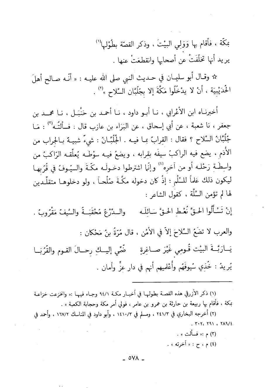 أَخْبَرَنَاهُ ابْنُ الأَعْرَابِيِّ نا أَبُو دَاوُدَ نا أَحْمَدُ بْنُ حَنْبَلٍ نا مُحَمَّدُ بْنُ جَعْفَرٍ نا شُعْبَةُ عَنْ أَبِي إِسْحَاقَ عَنِ الْبَرَاءِ بْنِ عَازِبٍ قَالَ: فَسَأَلْتُهُ 2 مَا جُلُبَّانُ السِّلاحِ فَقَالَ الْقِرَابُ بِمَا فِيهِ. الجُلُبَّانُ شيءٌ شبيهٌ بالجِراب من الأَدَمِ يضع فيه الراكبُ سيفَه بقِرابه ويضعُ فيه سوْطه يُعلِّقه الرّاكبُ من واسِطَة رَحْله أو من آخرِه 3 وإنّما اشترطوا دخولَه مكّةَ والسيُوفُ في قُرُبِها ليكون ذَلِكَ عَلمًا للسلم إذ كان دخوله مكَّةَ صُلْحًا ولو دخلوها متقلَّدين لها لمِ تؤمن السَّلَّة كقول الشاعر: