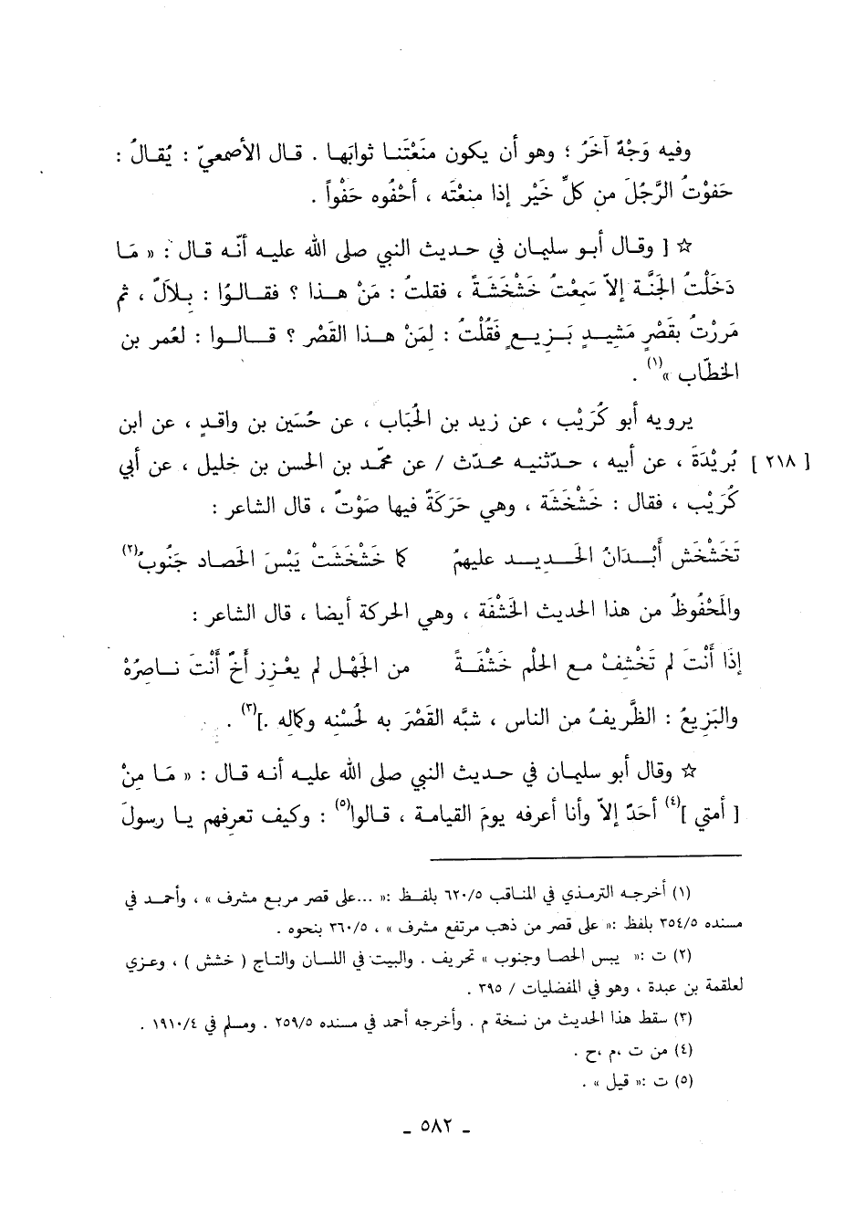يَرْوِيهِ أَبُو كُرَيْبٍ عَنْ زَيْدِ بْنِ الْحُبَابِ عَنْ حُسَيْنِ بْنِ وَاقِدٍ عَنِ ابْنِ بُرَيْدَةَ عَنْ أَبِيهِ حَدَّثَنِيه مُحَدِّثٌ عَنْ مُحَمَّدِ بْنِ الْحَسَنِ بْنِ خَلِيلٍ عَنْ أَبِي كُرَيْبٍ فَقَالَ خَشْخَشَة وهي حَرَكَةٌ فيها صَوْتٌ قَالَ الشاعر: