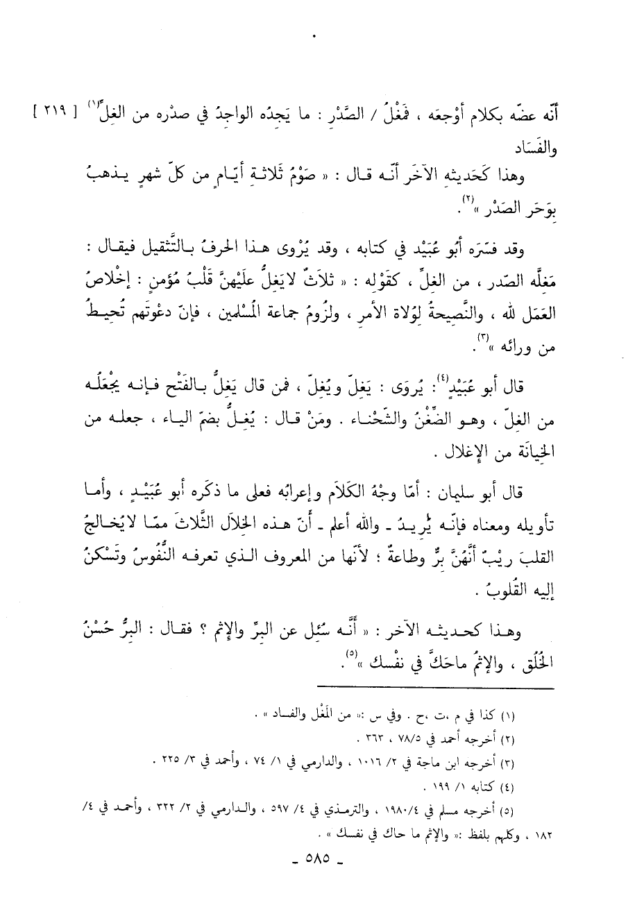 وقد فسّرَه أبُو عُبَيْد في كتابه وقد يُرْوى هذا الحرفُ بالتَّثقيل فيقال: مَغِلَّه الصّدر من الغِلِّ كقَوْلِه: "ثلاثٌ لا يَغِلُّ علَيْهنَ قَلْبُ مُؤمنٍ إخْلاصُ العَمَل لله والنَّصِيحةُ لِوُلاة الأمرِ ولزُومُ جماعة المُسْلمين فإنّ دعْوتَهم تُحِيطُ من ورائه" 3.