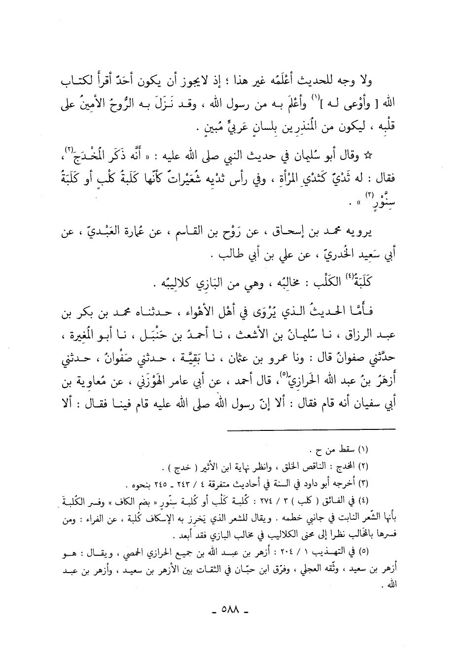 فَأَمَّا الْحَدِيثُ الَّذِي يُرْوَى فِي أَهْلِ الأَهْوَاءِ حَدَّثَنَاهُ مُحَمَّدُ بْنُ بَكْرِ بْنِ عَبْدِ الرَّزَّاقِ نا سُلَيْمَانُ بْنُ الأَشْعَثِ نا أَحْمَدُ بْنُ حَنْبَلٍ نا أَبُو الْمُغِيرَةِ حَدَّثَنِي صَفْوَانُ قَالَ ونا عَمْرُو بْنُ عُثْمَانَ نا بَقِيَّةُ حَدَّثَنِي صَفْوَانُ حَدَّثَنِي أَزْهَرُ بْنُ عَبْدِ اللَّهِ الْحَرِازِيُّ 4 قَالَ: أَحْمَدُ عَنْ أَبِي عَامِرٍ الْهَوْزَنِيِّ عَنْ مُعَاوِيَةَ بْنِ أَبِي سُفْيَانَ أَنَّهُ قَامَ فَقَالَ أَلا إِنَّ رَسُولَ اللَّهِ قام فينا فقال: "ألا