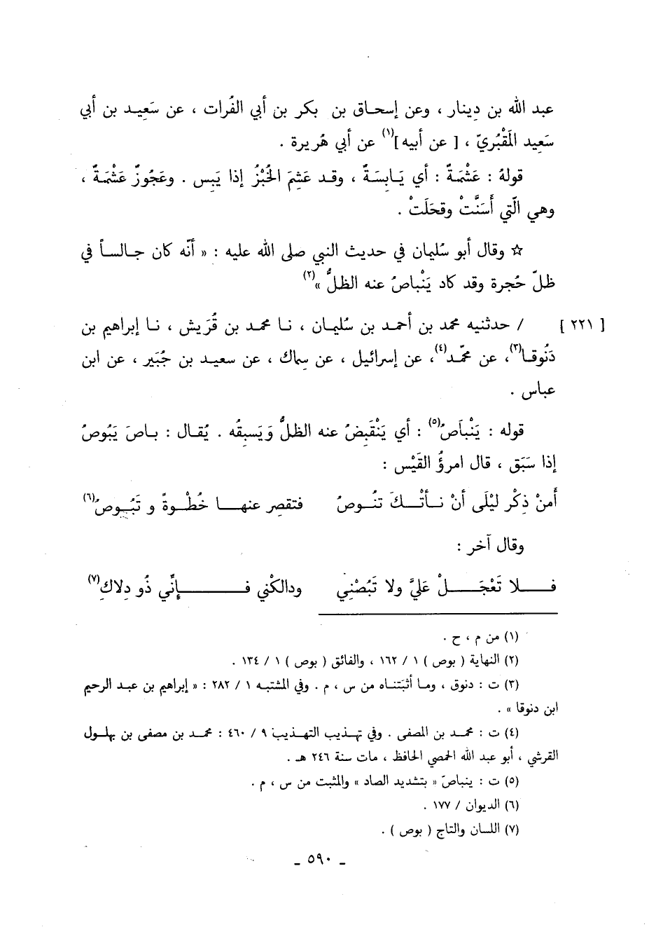 وَقَال أَبُو سُلَيْمَانَ فِي حَدِيثِ النَّبِيِّ صَلَّى اللَّهُ عَلَيْهِ وَسَلَّمَ: أَنَّهُ كَانَ جَالِسًا فِي ظل حجرة وقد كاد يَنْبَاصُ عَنْهُ الظِّلُّ 1.