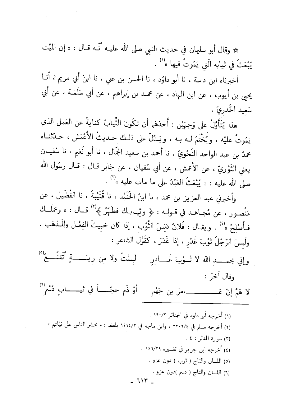 وَقَالَ أَبُو سُلَيْمَانَ فِي حَدِيثِ النَّبِيِّ صَلَّى اللَّهُ عَلَيْهِ وَسَلَّمَ أَنَّهُ قَالَ: "إنِ الْمَيِّتِ يُبْعَثُ فِي ثِيَابِهِ الَّتِي يَمُوتُ فِيهَا" 1.