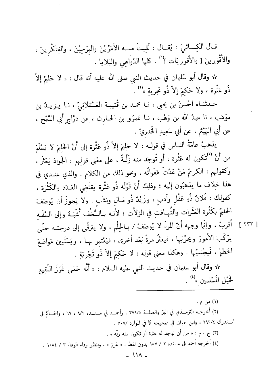وَقَالَ أَبُو سُلَيْمَانَ فِي حَدِيثِ النَّبِيِّ صَلَّى اللَّهُ عَلَيْهِ وَسَلَّمَ أَنَّهُ قَالَ: "لا حَلِيمَ إِلا ذُو عَثْرَةٍ وَلا حَكِيمَ إِلا ذُو تَجْرِبَةٍ" 1.