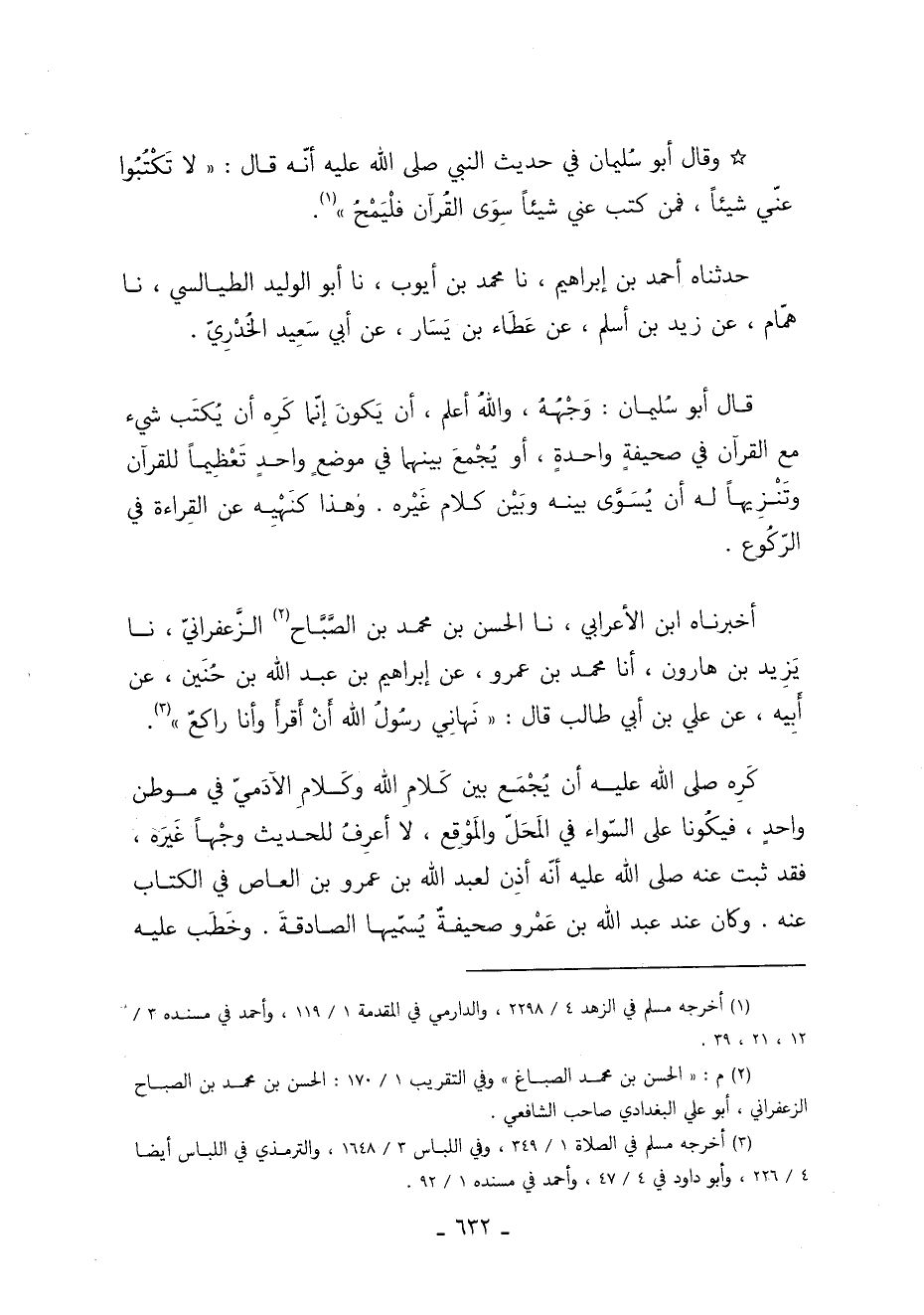 وَقَالَ أَبُو سُلَيْمَانَ فِي حَدِيثِ النَّبِيِّ صَلَّى اللَّهُ عَلَيْهِ وَسَلَّمَ أَنَّهُ قَالَ: "لا تَكْتُبُوا عَنِّي شَيْئًا فَمَنْ كَتَبَ عَنِّي شَيْئًا سِوَى الْقُرْآنِ فَلْيَمْحُ" 1.
