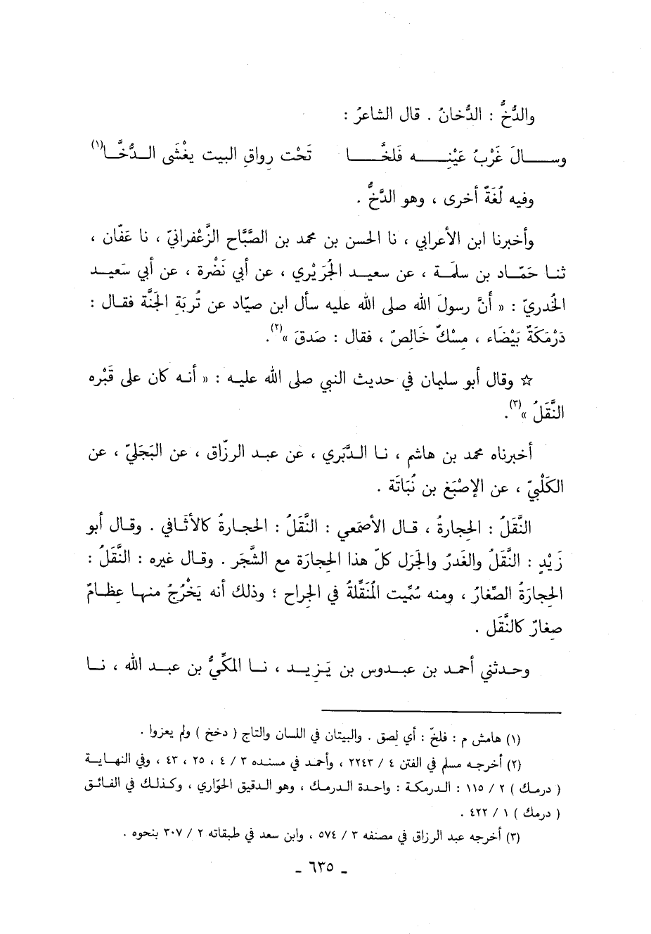 وَأَخْبَرَنَا ابْنُ الأَعْرَابِيِّ نا الْحَسَنُ بْنُ مُحَمَّدِ بْنِ الصَّبَّاحِ الزَّعْفَرَانِيُّ نا عَفَّانُ ثنا حَمَّادُ بْنُ سَلَمَةَ عَنْ سَعِيدٍ الْجَرِيرِيِّ عَنْ أَبِي نَضْرَةَ عَنْ أَبِي سَعِيدٍ الْخُدْرِيِّ أَنّ رسول الله سَأَلَ ابْنَ صَيَّادٍ عَنْ تُرْبَةِ الْجَنَّةِ فَقَالَ دَرْمَكَةٌ بَيْضَاءُ مِسْكٌ خالص فقال: "صدق" 2.