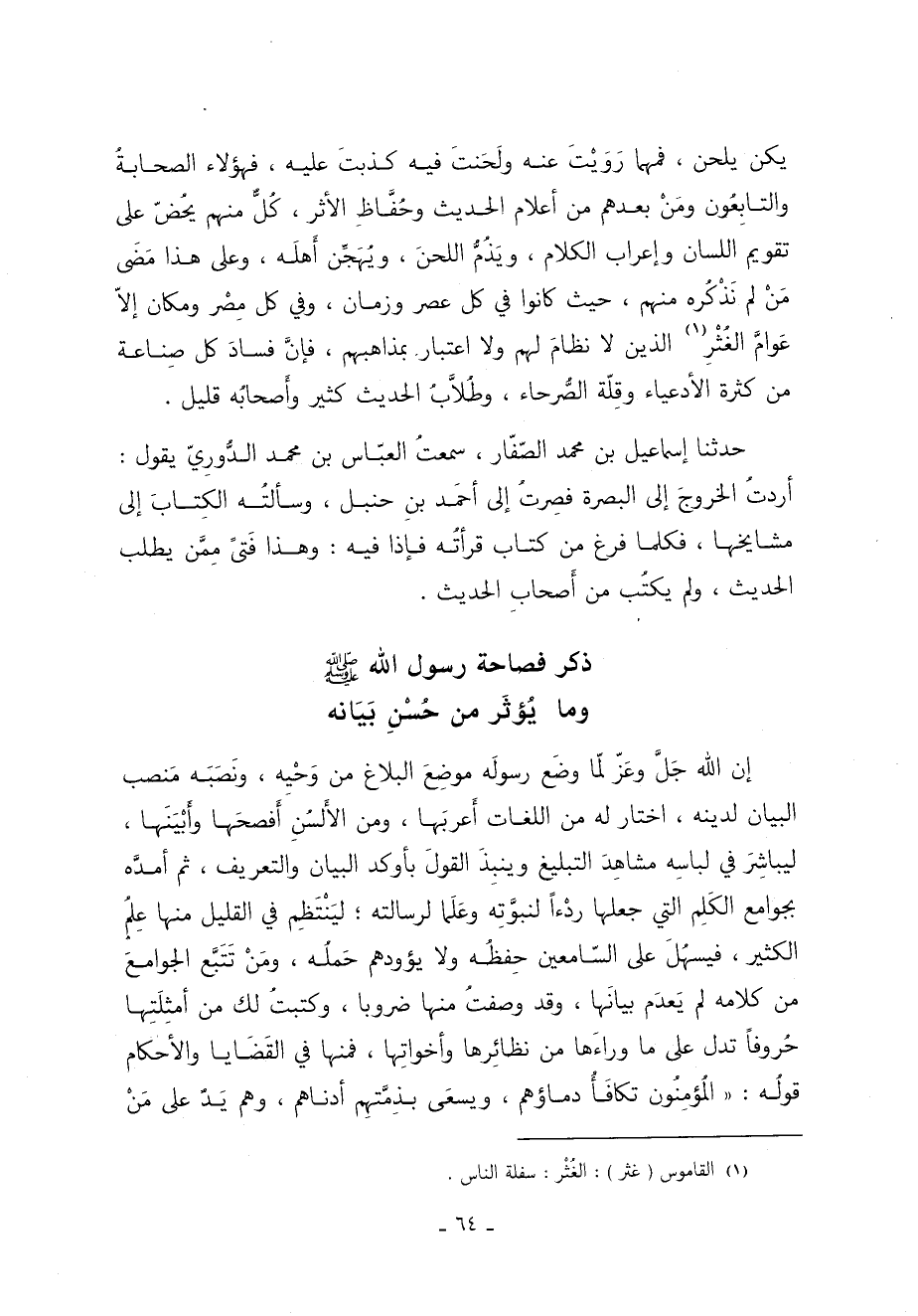يكن يلحن، فمهما رويت عنه ولحنت فيه كذبت عليه، فهؤلاء الصحابة والتابعون ومن بعدهم من أعلام الحديث وحفاظ الأثر كل منهم يحض على تقويم اللسان وإعراب الكلام، ويذم اللحن ويهجن أهله، وعلى هذا مضى من لم نذكره منهم، حيث كانوا في كل عصر وزمان، وفي كل مصر ومكان إلا عوام الغُثْر الذين لا نظام لهم ولا اعتبار بمذاهبهم، فإن فساد كل صناعة من كثرة الأدعياء وقلة الصرحاء، وطلاب الحديث كثير وأصحابه قليل.