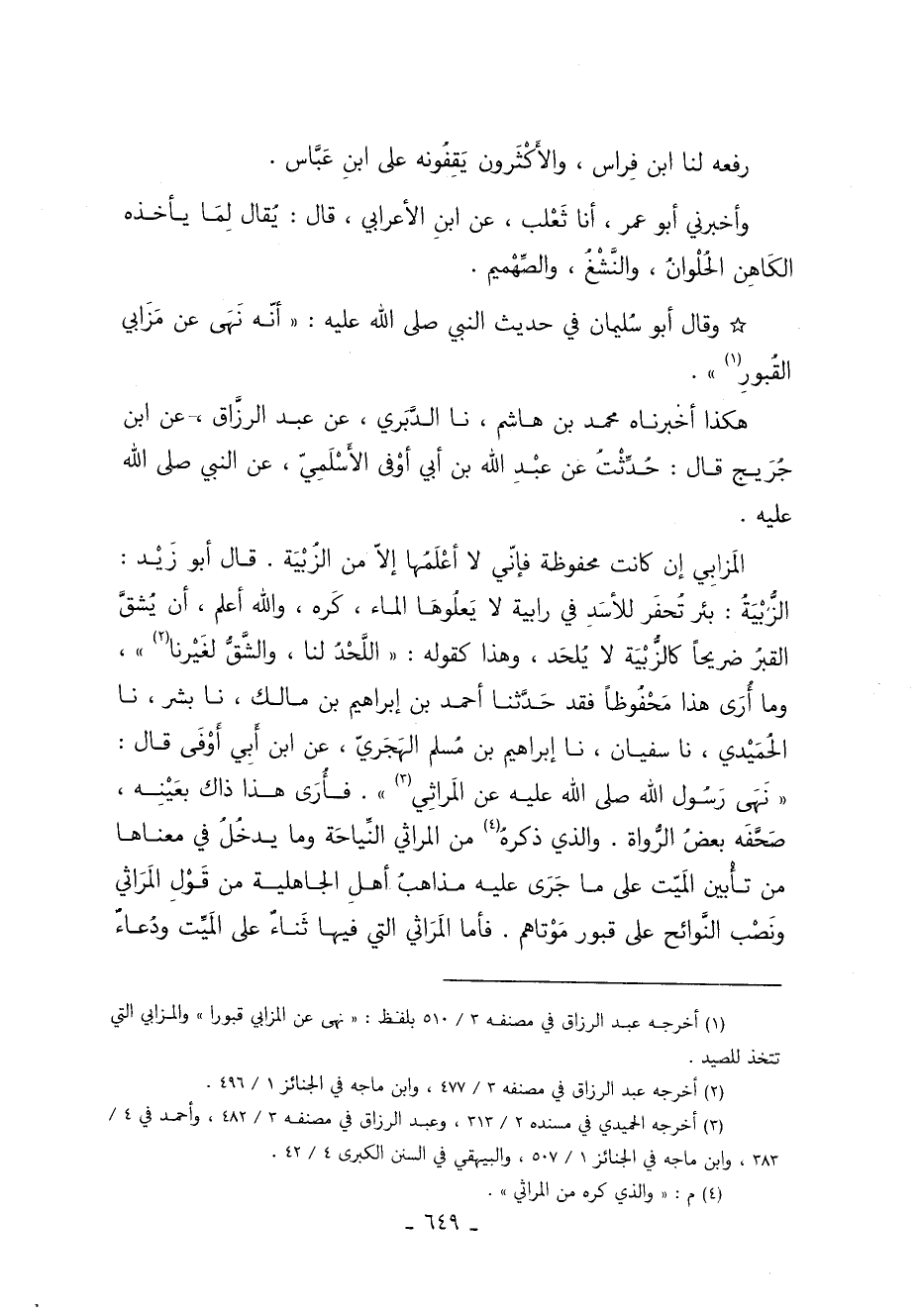 3 أخرجه الحميدي في مسنده 2/ 313 وعبد الرزاق في مصنفه 3/ 482 وأحمد في 383 وابن ماجه في الجنائز 1/ 507 والبيهقي في السنن الكبرى 4/ 24.