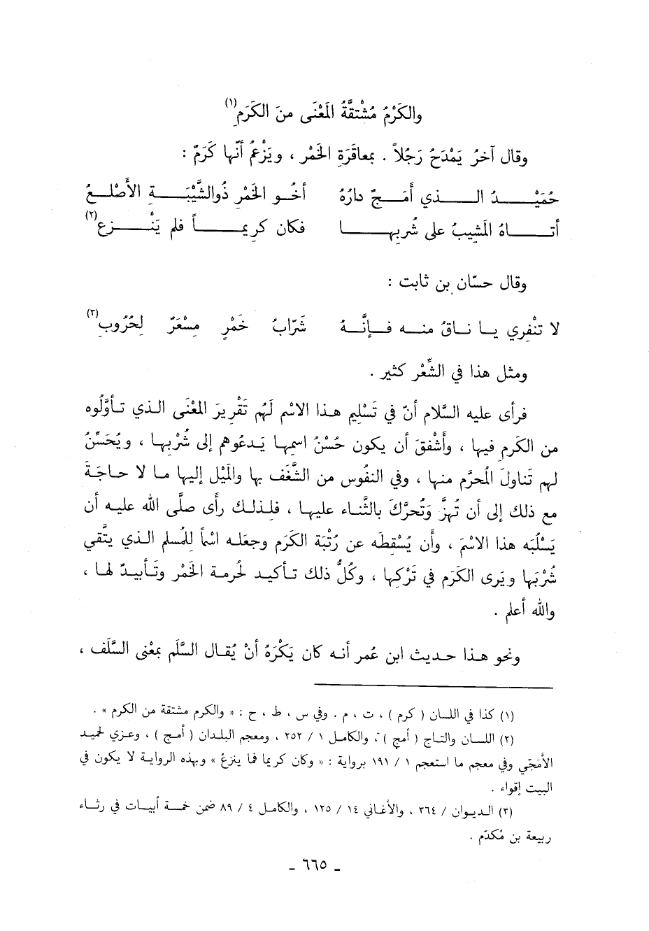 فرأى عَلَيْهِ السَّلام أنّ في تَسْلِيم هذا الاسْم لَهُم تَقْرِيرَ المعْنَى الَّذِي تأوَّلُوه من الكَرمِ فيها وأَشْفقَ أن يكون حُسْنُ اسمِها يَدعُوهم إلى شُرْبِها ويُحَسِّنُ لهم تَناولَ المُحرَّم منها وفي النفُوس من الشَّغَف بها والمَيْل إليها ما لا حاجَةَ مَعَ ذَلِكَ إلى أن تُهزَّ وَتُحرَّكَ بالثناء عليها فلذلك رأى أن يَسْلُبَه هذا الاسْمَ وأَن يُسْقِطَه عَنْ رُتْبَة الكَرَم وجعَله اسْمًا لِلمُسلم الَّذِي يتَّقي شُرْبَها ويَرى الكَرَم في تَرْكِها وكُلُّ ذلك تأكيد لحرمة الخمر وتأبيد لها والله أعلم.