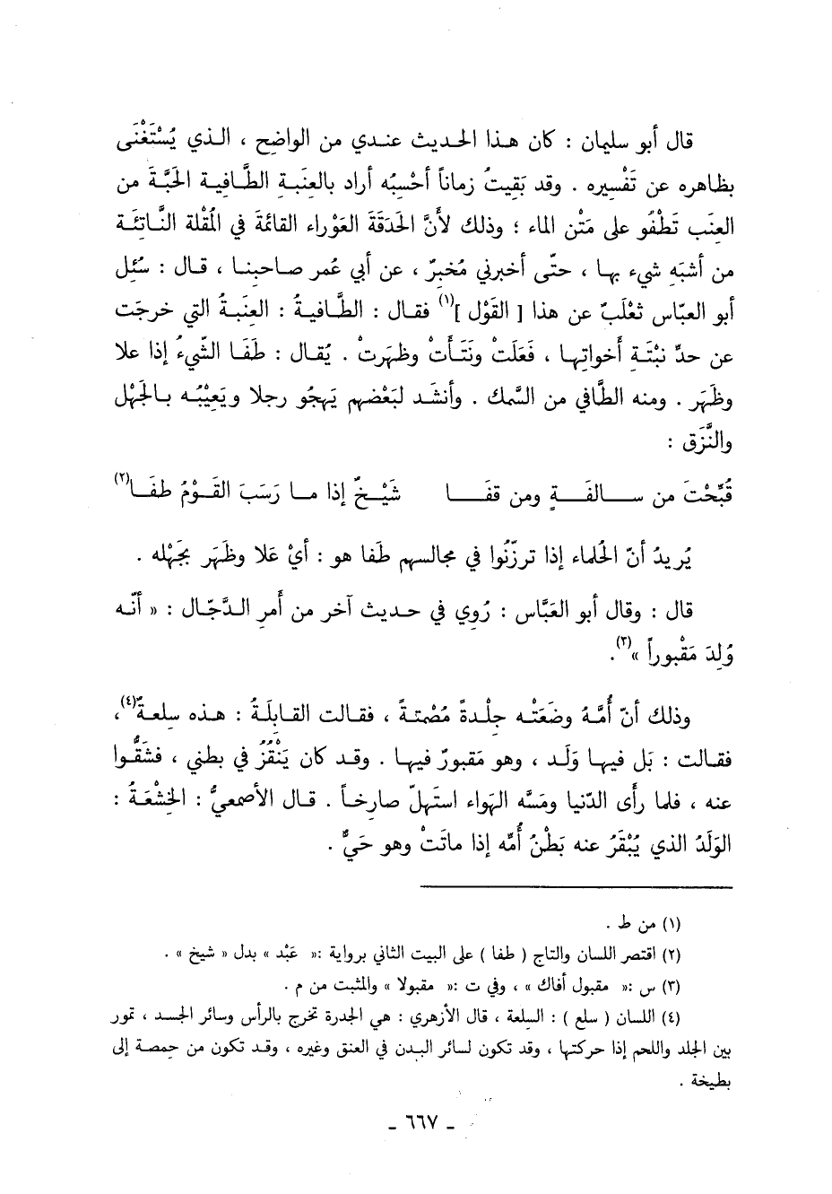 قَالَ أَبُو سُلَيْمَانَ كَانَ هذا الحديث عندي من الواضِح الَّذِي يُسْتَغْنَى بظاهره عَنْ تِفْسِيره. وقد بَقِيتُ زمانًا أحْسِبُه أراد بالعِنَبةِ الطَّافِية الحَبَّةَ من العِنَب تَطْفُو عَلَى مَتْن الماء وذلك لأَنَّ الحَدَقَةَ العَوْراء القائمةَ في المُقْلة النَّاتِئَة من أشبَهِ شيء بها حتّى أخبرني مُخبِرٌ عَنْ أَبِي عُمر صاحبِنا قَالَ سُئِل أبو العَبَّاس ثَعْلَبٌ عَنْ هذا القَوْل 1 فَقَالَ الطَّافيةُ: العِنَبةُ التي خرجَت عَنْ حدِّ نبْتَةِ أَخواتِها فَعَلَتْ ونَتَأَتْ وظهرَتْ. يُقال طَفَا الشّيءُ إذَا علا وظَهَر. ومنه الطَّافي من السَّمك. وأنشَد لبَعْضهم يَهجُو رجلًا ويَعِيبُه بالجَهْل والنَّزَق: