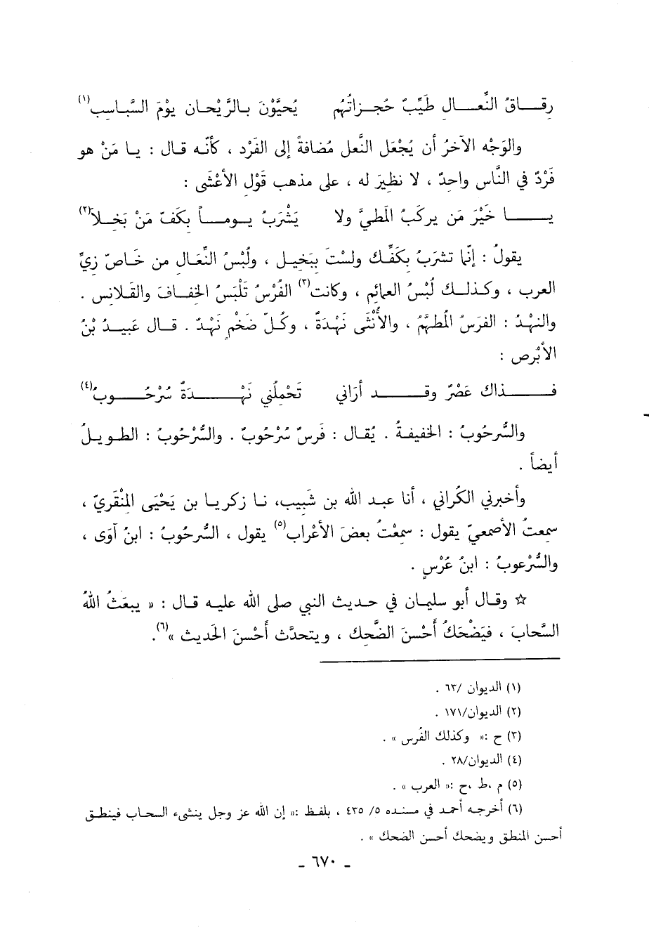 يقولُ: إنّما تشرَبُ بِكَفِّك ولسْتَ بِبَخِيل ولُبْسُ النِّعَالِ من خَاصّ زِيِّ العرب وكذلك لُبْسُ العمائِم وكانت 3 الفُرْسُ تَلْبَسُ الخِفافَ والقَلانِس. والنهْدُ الفَرسُ المُطهَّمُ والأُنْثَى نَهْدَةٌ وكُلَ ضَخْمٍ نَهْدٌ. قَالَ عُبَيْدُ بْنُ الأبْرص: