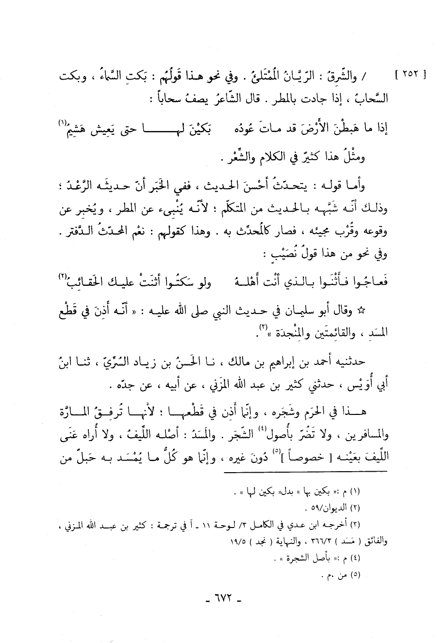 هذا في الحرَم وشَجَره وإنّما أَذِن في قَطْعها لأنها تُرفِقُ المارَّة والمسافرين. ولا تَضُرّ بأُصول 2 الشّجَر. والمَسَدُ: أصْله اللِّيفُ ولا أُراه عَنَى اللِّيفَ بعَيْنه خصوصا 3 دُونَ غيره وإنّما هُوَ كُلُّ ما يُمْسَد بِهِ حبل من