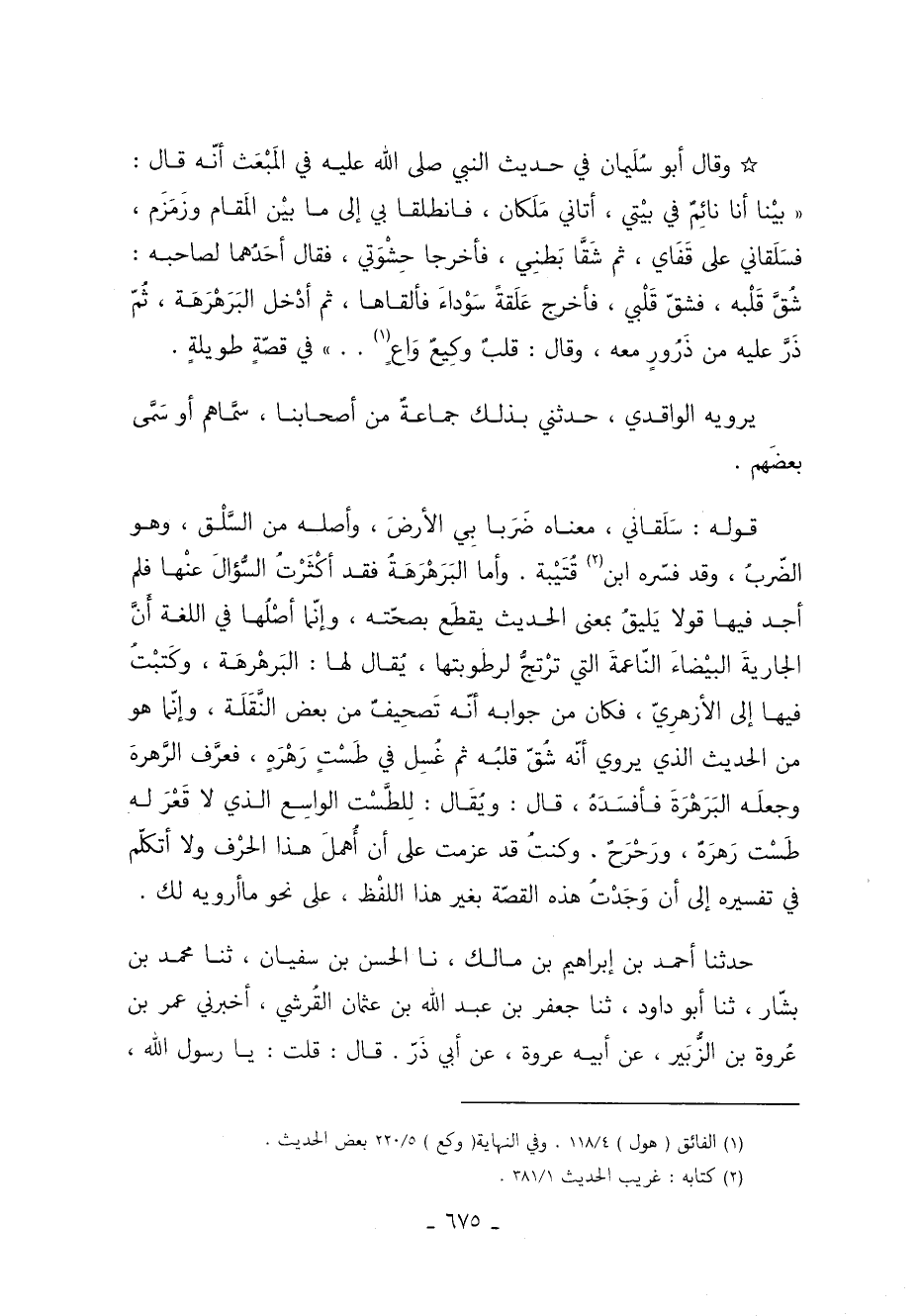 قوله: سَلَقاني معناه ضَرَبا بِي الأرضَ وأصله من السَّلْق وهو الضّربُ وقد فسّره 2 ابن قُتَيْبة. وأما البَرَهْرَهَةُ فقد أكْثَرْتُ السُّؤالَ عنْها فلم أجد فيها قولا يَليقُ بمعنى الحديث يقطع بصحّته وإنّما أصْلُها في اللغة أَنَّ الجاريةَ البيْضاءَ النّاعمةَ التي ترْتجُّ لرطوبتها يُقال لها البَرهْرهَة وكَتبْتُ فيها إلى الأزهرِيّ فكان من جوابه أنّه تَصحِيفٌ من بعض النَّقَلَة وإنّما هُوَ من الحديث الَّذِي يروي أَنَّهُ شُقّ قلبُه ثُمَّ غُسِل في طَسْتٍ رَهْرَهٍ فعرَّف الرَّهرهَ وجعلَه البَرَهْرَهَ فأفسَدهُ قَالَ ويُقَال للِطَّسْت الواسِع الَّذِي لا قَعْرَ لَهُ طَسْت رَهرَهٌ ورَحْرَحٌ. وكنتُ قد عزمت عَلَى أن أُهملَ هذا الحرْف ولا أتكلّم في تفسيره إلى أن وَجَدْتُ هذه القصّة بغير هذا اللْفظ عَلَى نحو ما أرويه لك.