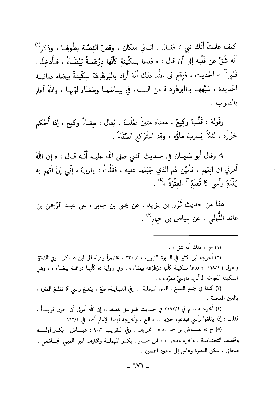 كَيْفَ عَلِمْتَ أَنَّكَ نَبِيٌّ فَقَالَ: "أَتَانِي مَلَكَانِ" وَقَصَّ الْقِصَّةَ بِطُولِهَا وَذَكَرَ 1 أَنَّهُ شُقَّ عَنْ قَلْبِهِ إِلَى أَنْ قَالَ: "فَدَعَا بِسِكِّينَةٍ كَأَنَّهَا دِرْهَمَةٌ بَيْضَاءُ فَأُدْخِلَتْ قَلْبِي" 2 الْحَدِيثَ فَوَقَعَ لِي عِنْدَ ذَلِكَ أَنَّهُ أَرَادَ بِالْبَرَهْرَهَةِ سِكِّينَةً بَيْضَاءَ صَافِيةَ الْحَدِيدَةِ شَبَّهَهَا بِالْبَرَهْرَهَةِ مِنَ النِّسَاءِ فِي بَيَاضِهَا وَصَفَاءِ لَوْنِهَا وَاللَّهُ أَعْلَمُ بِالصَّوَابِ.